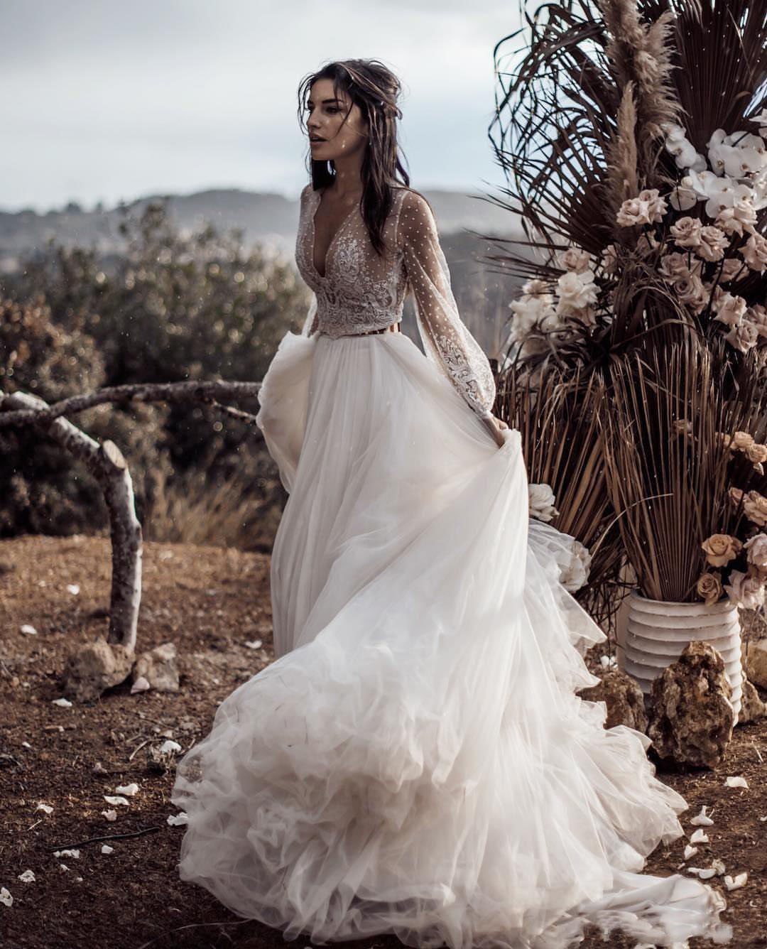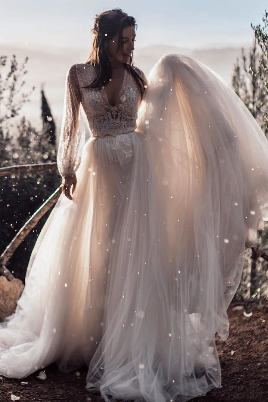 A Line Long Sleeves Ivory V Neck Beach Wedding Dresses with Lace Appliques, Bridal Dresses SRS15491