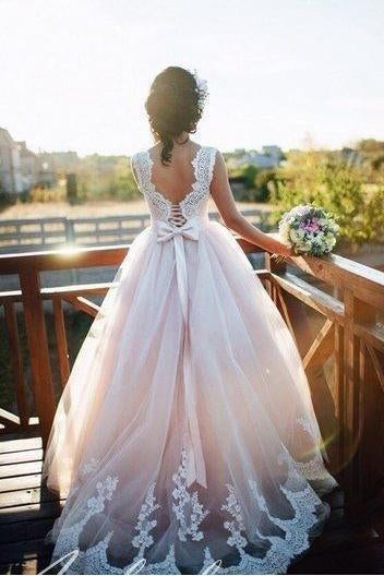 A Line Nude Tulle Pink Lace Appliqued Ball Gown Lace up Beach Wedding Dresses RS918