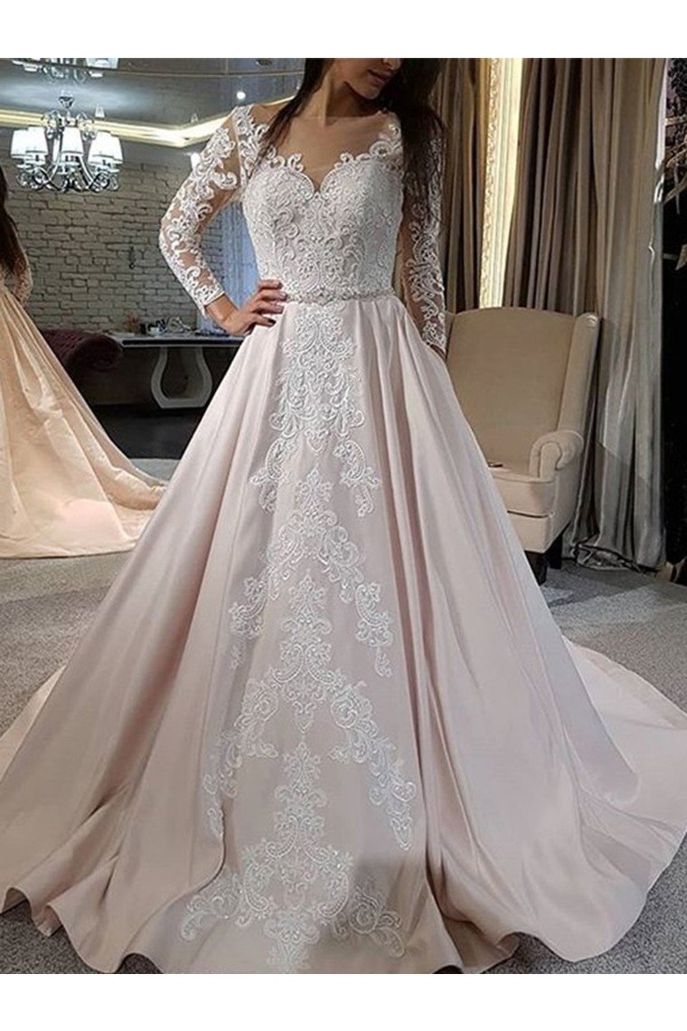 A-Line/Princess Satin Applique V-Neck Long Sleeves Sweep/Brush Train Wedding Dresses