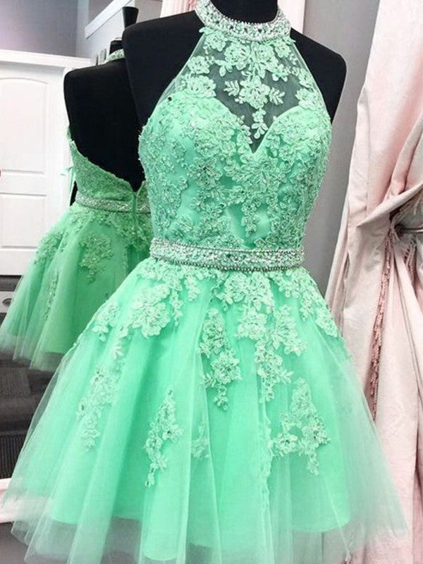 A-Line/Princess Sleeveless Kassandra Homecoming Dresses Halter Tulle Applique Short/Mini Dresses