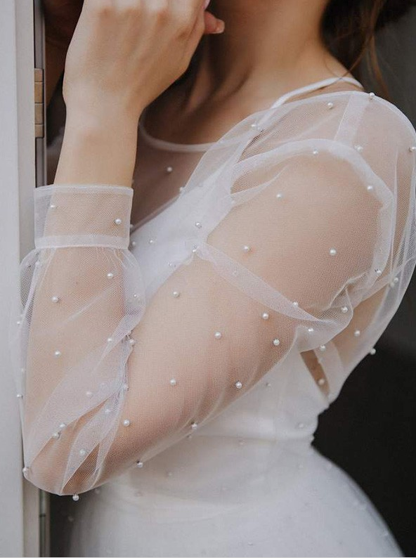 A-Line/Princess Tulle Beading Scoop Long Sleeves Sweep/Brush Train Wedding Dresses