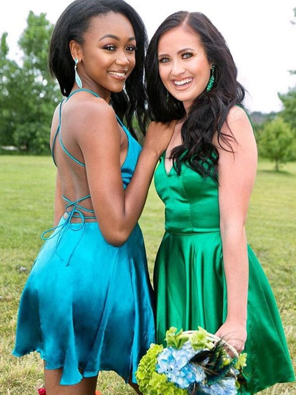 A-Line/Princess Ximena Homecoming Dresses Satin Ruffles V-Neck Sleeveless Short/Mini Dresses