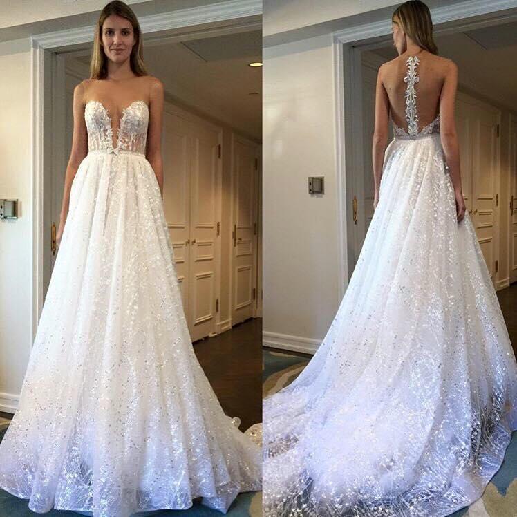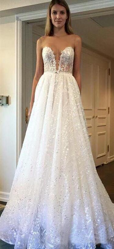 A Line Scoop Sleeve Ivory Sequins Sweep Train Wedding Dresses Wedding Gowns RS984