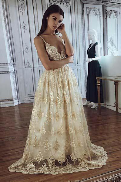 A line Spaghetti Straps Deep V Neck Lace Appliques Wedding Dresses Bridal Dresses RS935