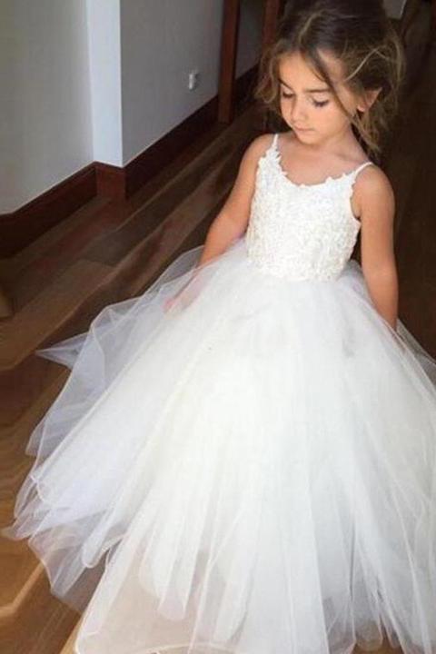 A Line Spaghetti Straps Lace Top Ivory Tulle Flower Girl Dresses For Wedding Party RS773