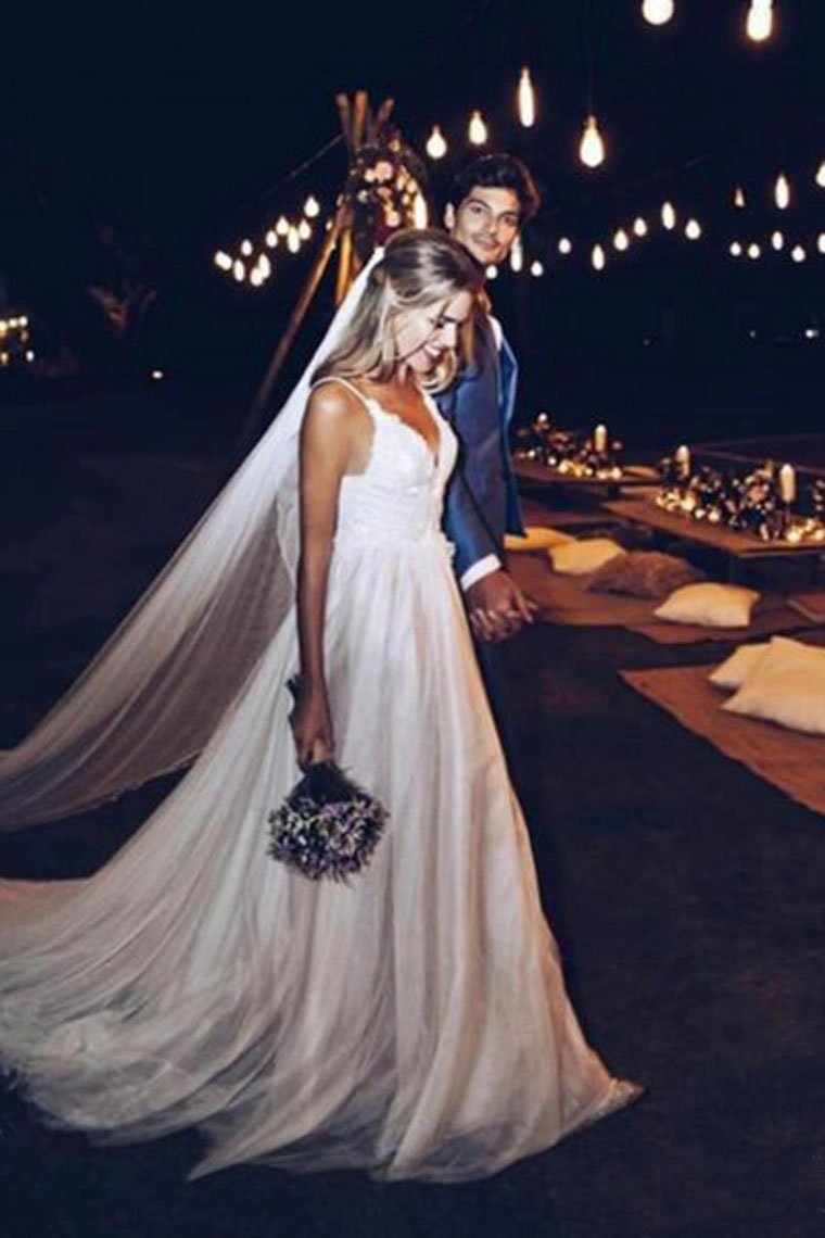 A Line Spaghetti Straps V Neck Beach Wedding Dresses Backless Summer Bridal Dresses SRS15494
