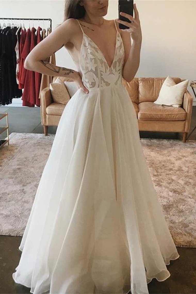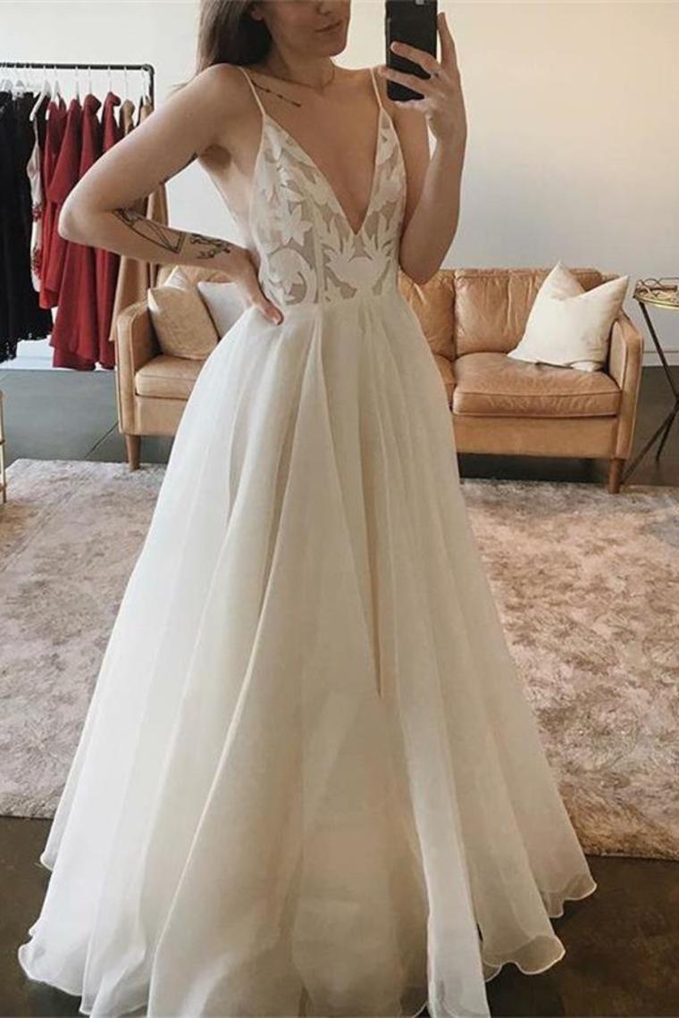 A-Line Spaghetti Straps V-Neck Floor Length Ivory Long Beach Wedding Dresses