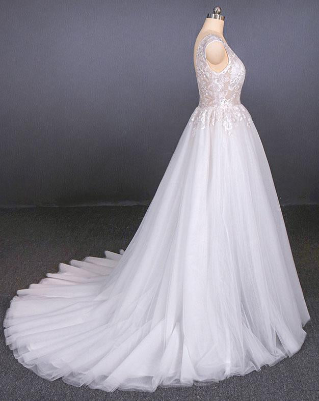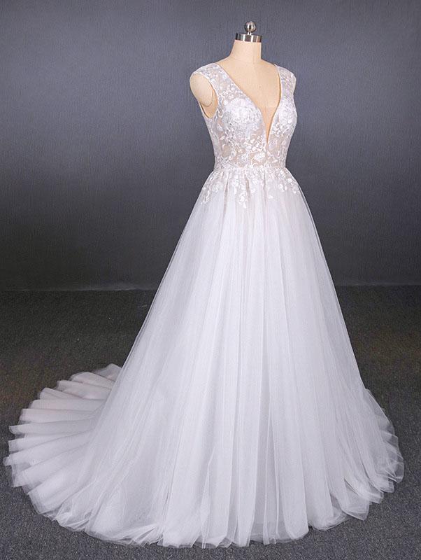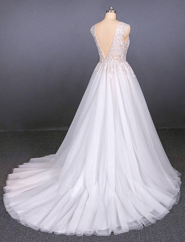 A Line Straps V Neck Lace Appliques Tulle Wedding Dresses Long Wedding Gowns SRS15034
