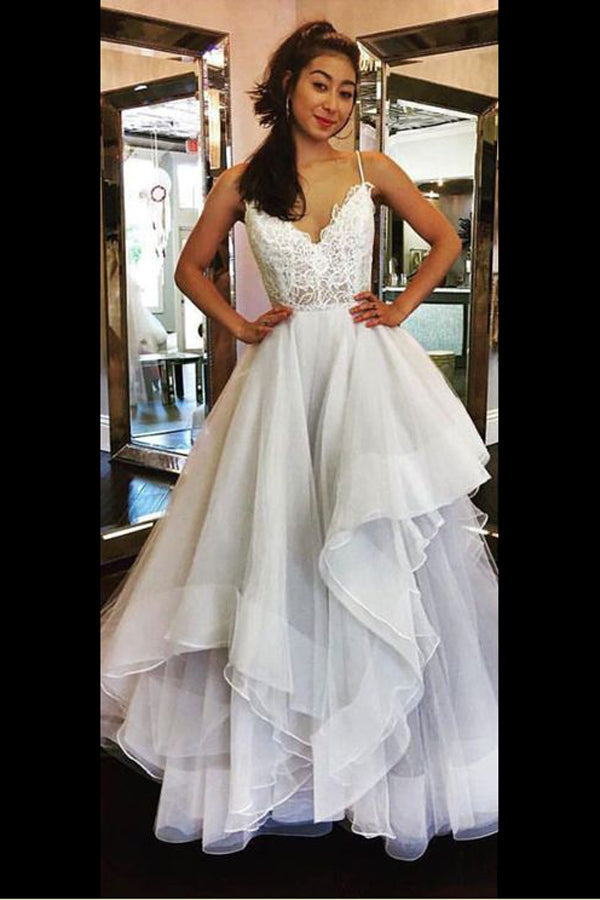 A Line Sweep Train Sweetheart Spaghetti Sleeveless Mid Back Appliques Ruffles Wedding Dresses