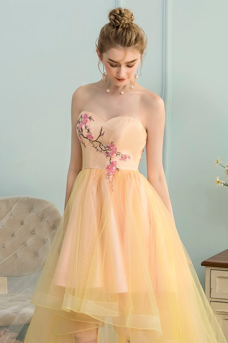 A-Line Sweetheart High Low Yellow Stretch With Homecoming Dresses Satin Madelynn Appliques