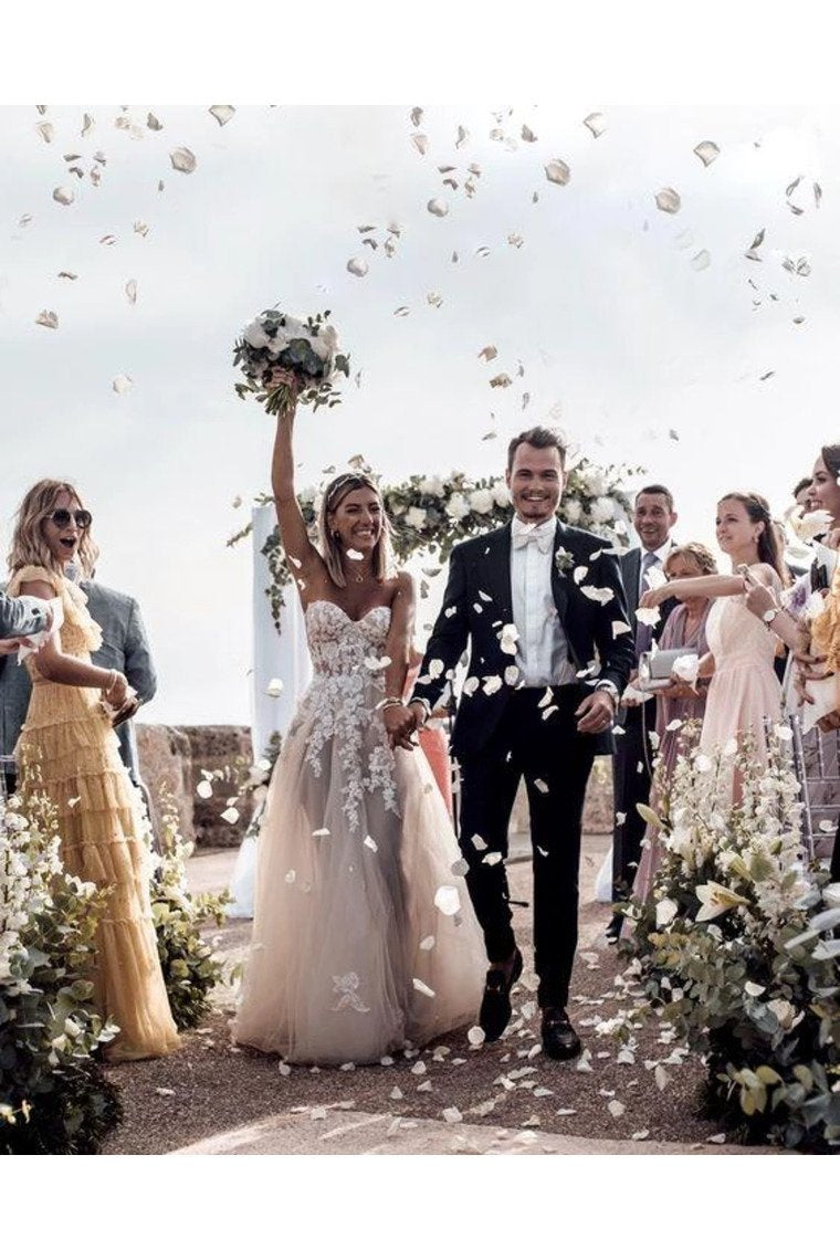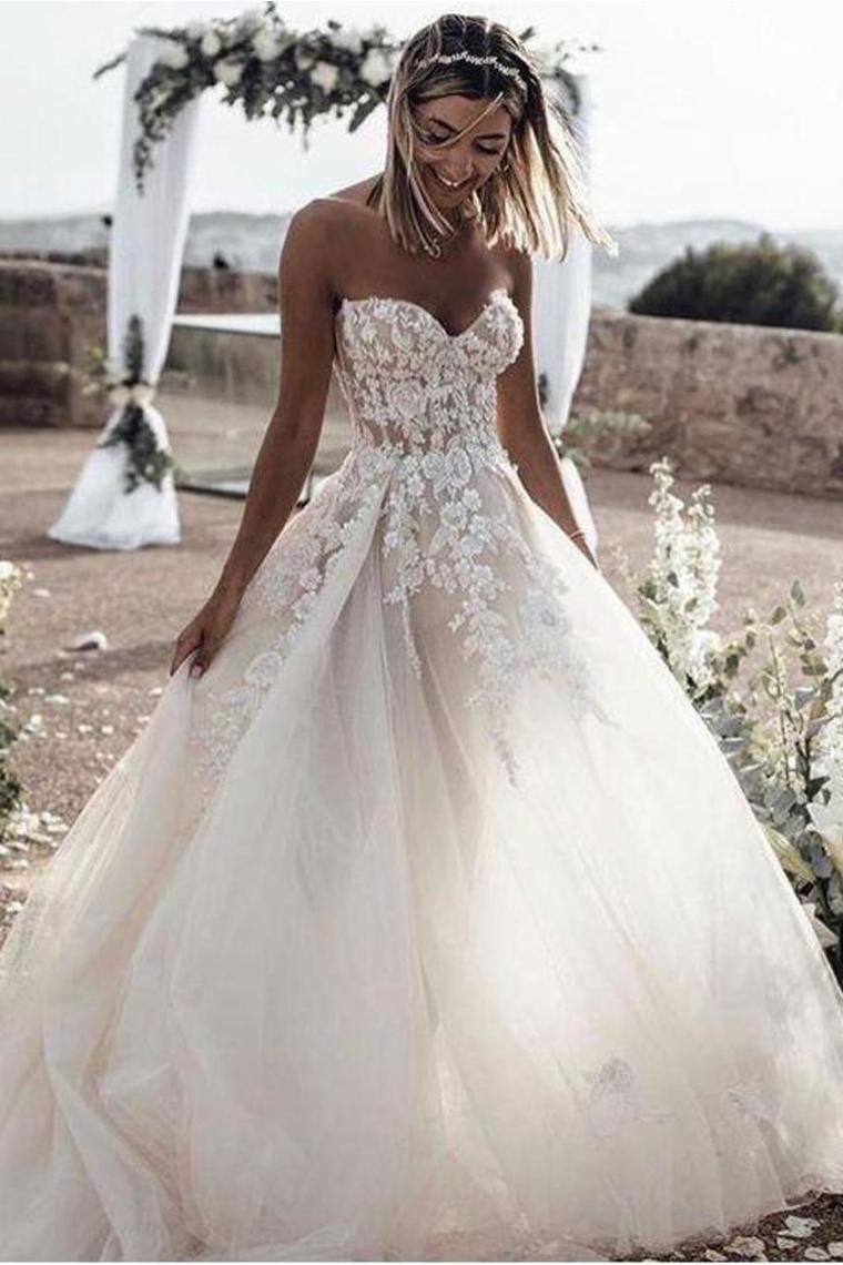 A Line Sweetheart Long Cheap Tulle Wedding Dresses With Lace Appliques