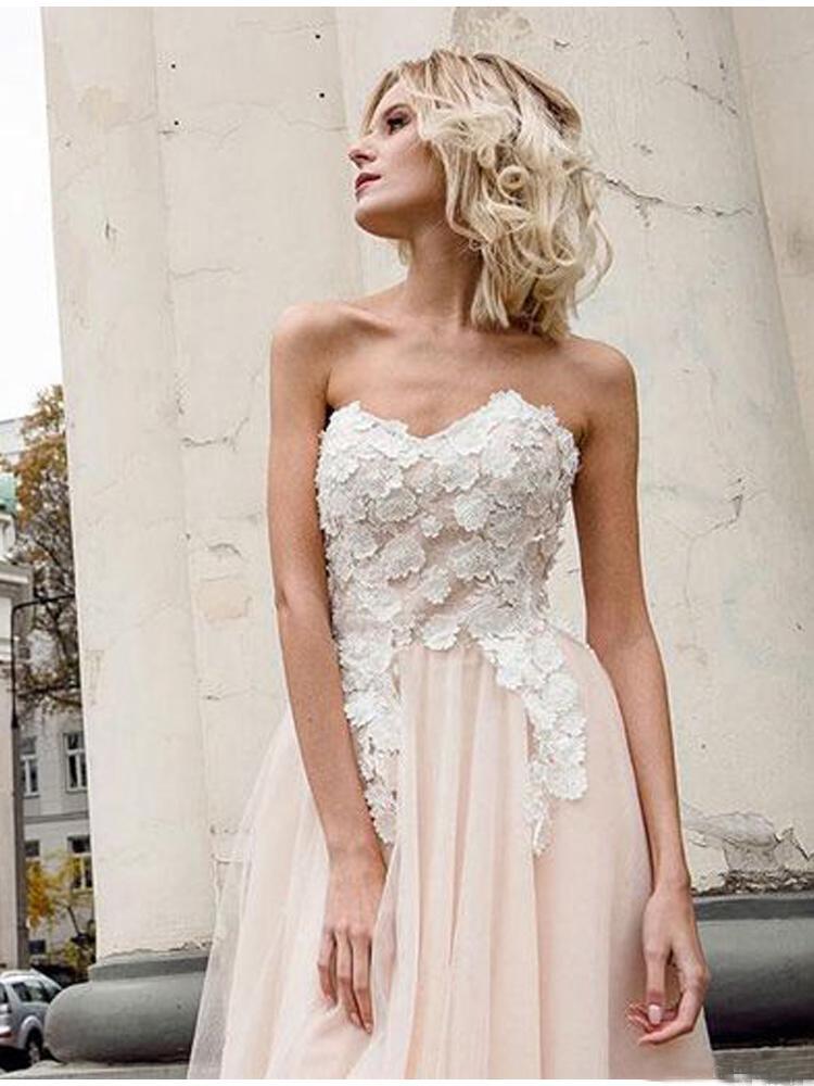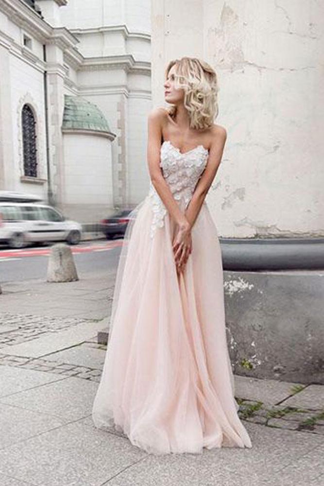 A Line Sweetheart Tulle Pink Prom Dresses with Appliques Beach Wedding Dresses RS970