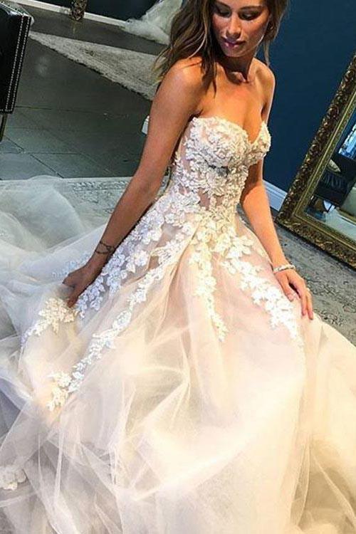 A Line Sweetheart Tulle Wedding Dress with Lace Appliques Long Prom Formal Dresses W1084