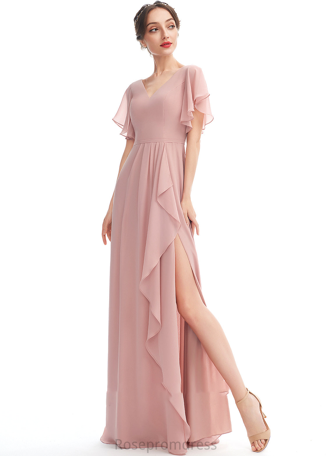A-Line V-neck Embellishment Floor-Length Neckline SplitFront Silhouette Fabric Ruffle Length Alexandria Natural Waist Bridesmaid Dresses