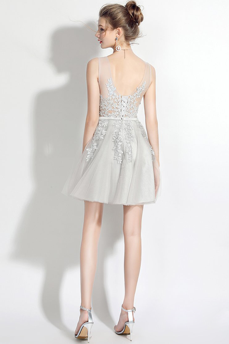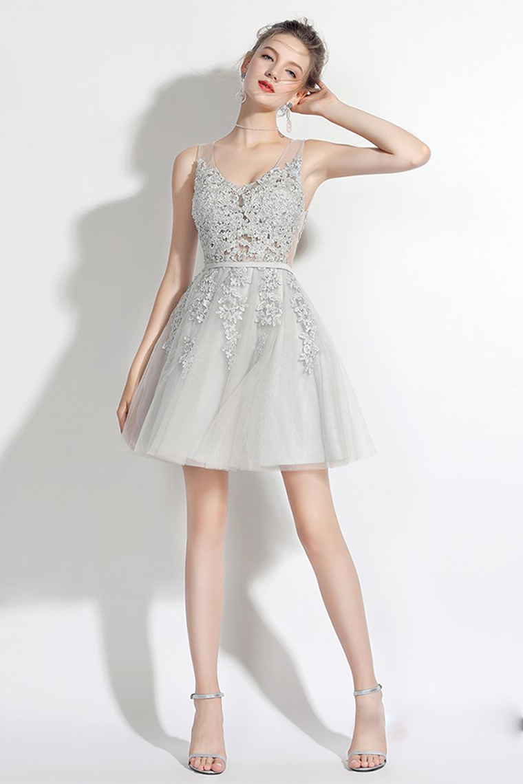 A-Line V-Neck Grey With Sash Homecoming Dresses Zara Appliques