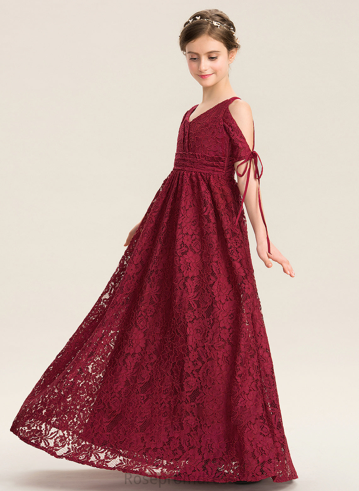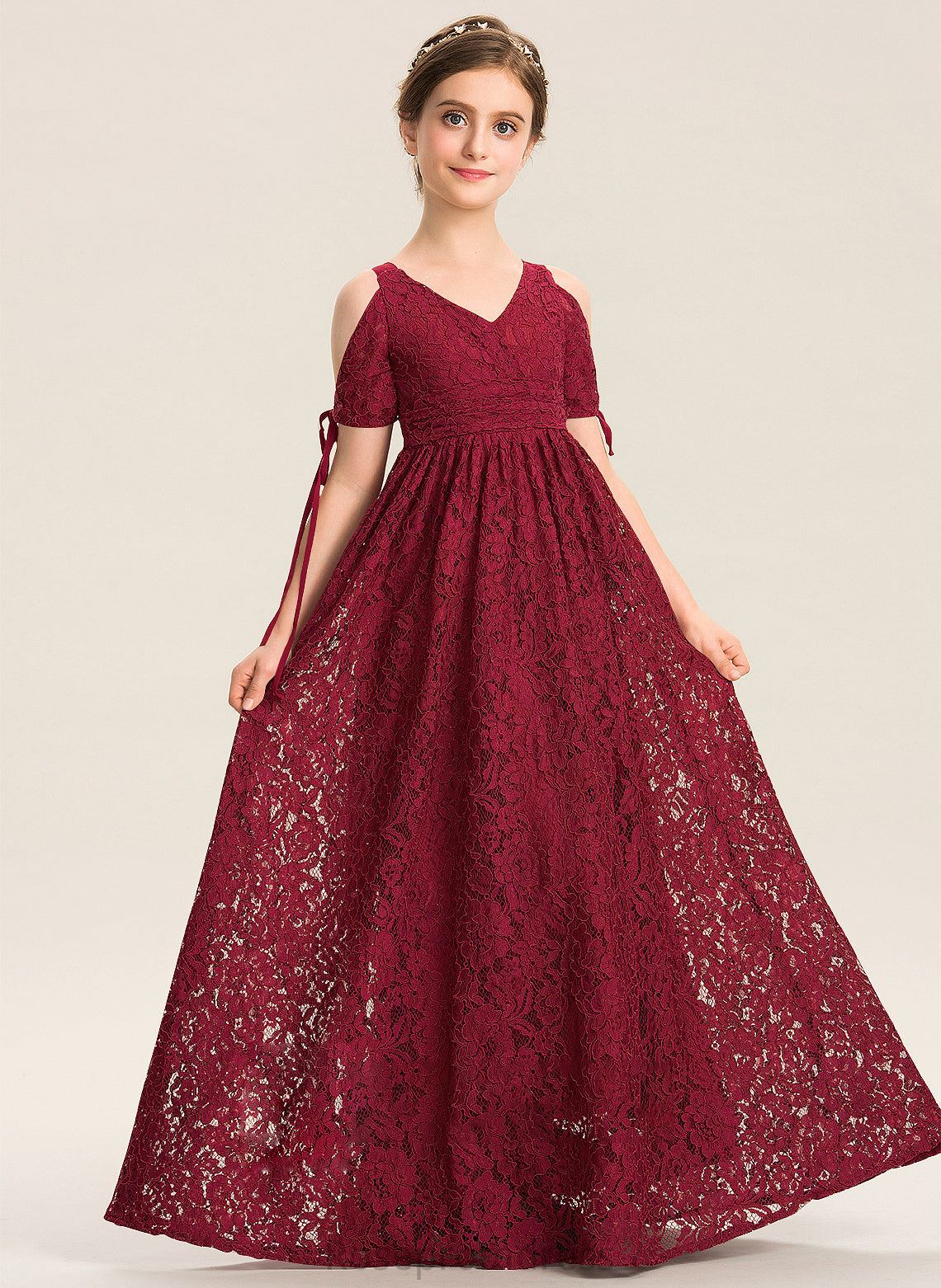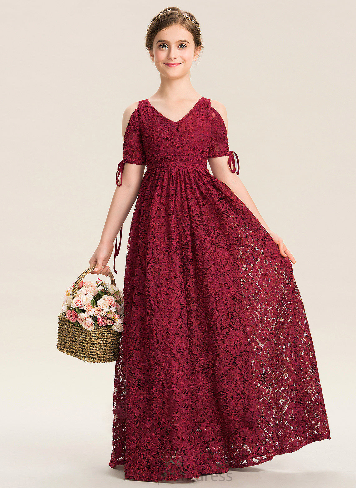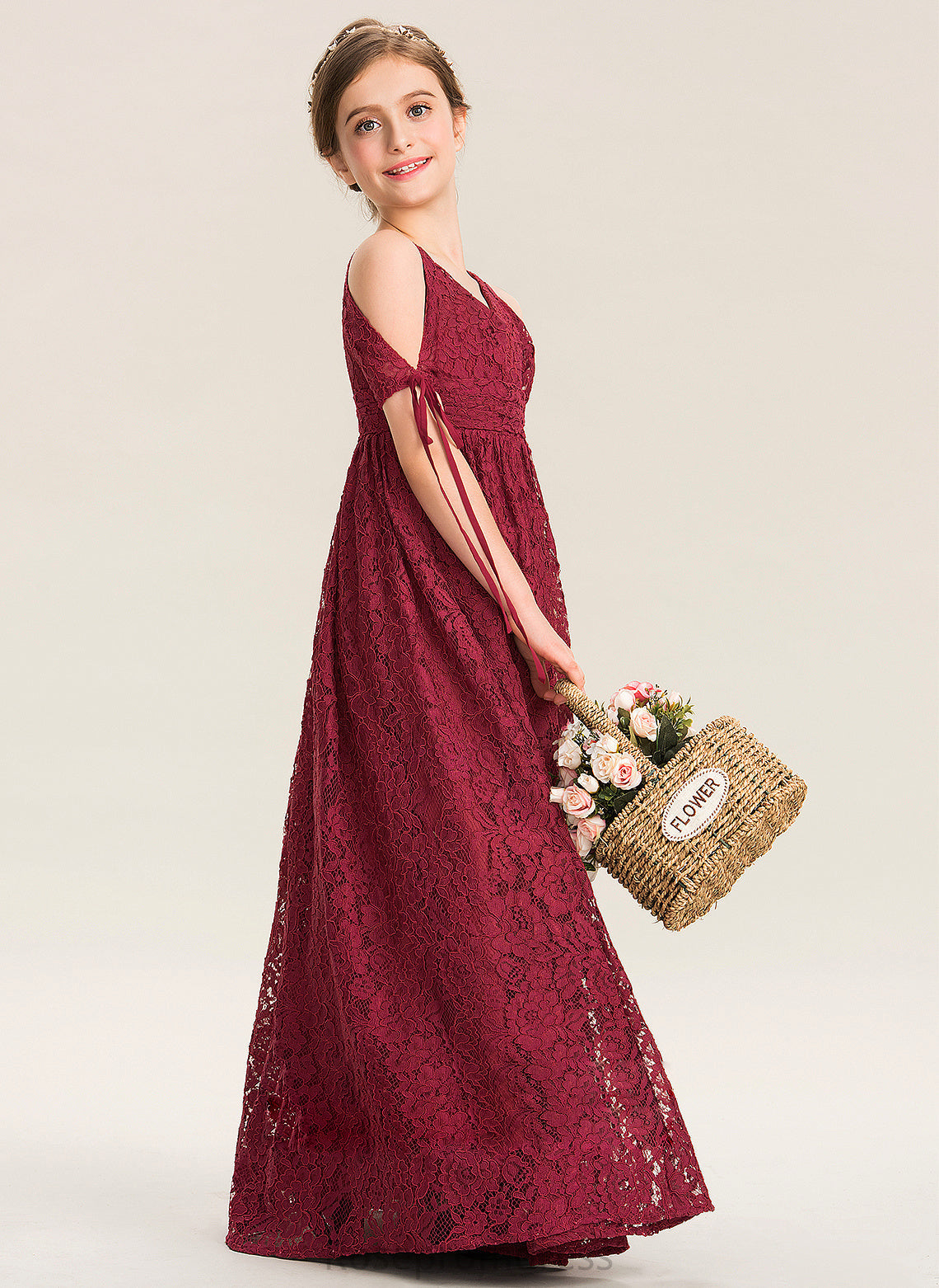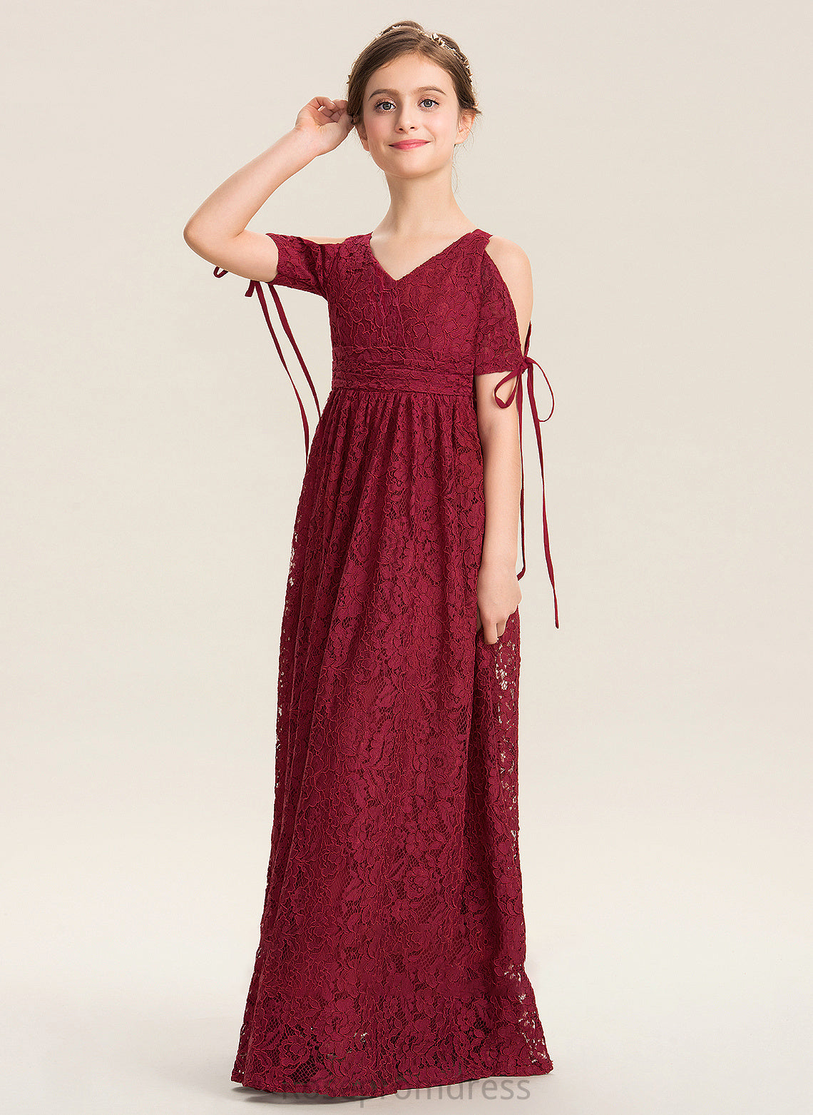 A-Line V-neck Lace Bow(s) Isabelle Floor-Length Ruffle Junior Bridesmaid Dresses With