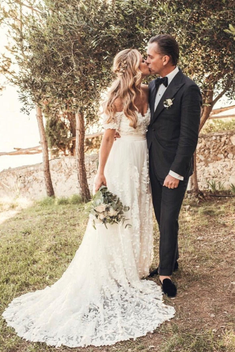 A Line V Neck Off the Shoulder Lace Short Sleeve Backless Long Beach Wedding Dresses RS198