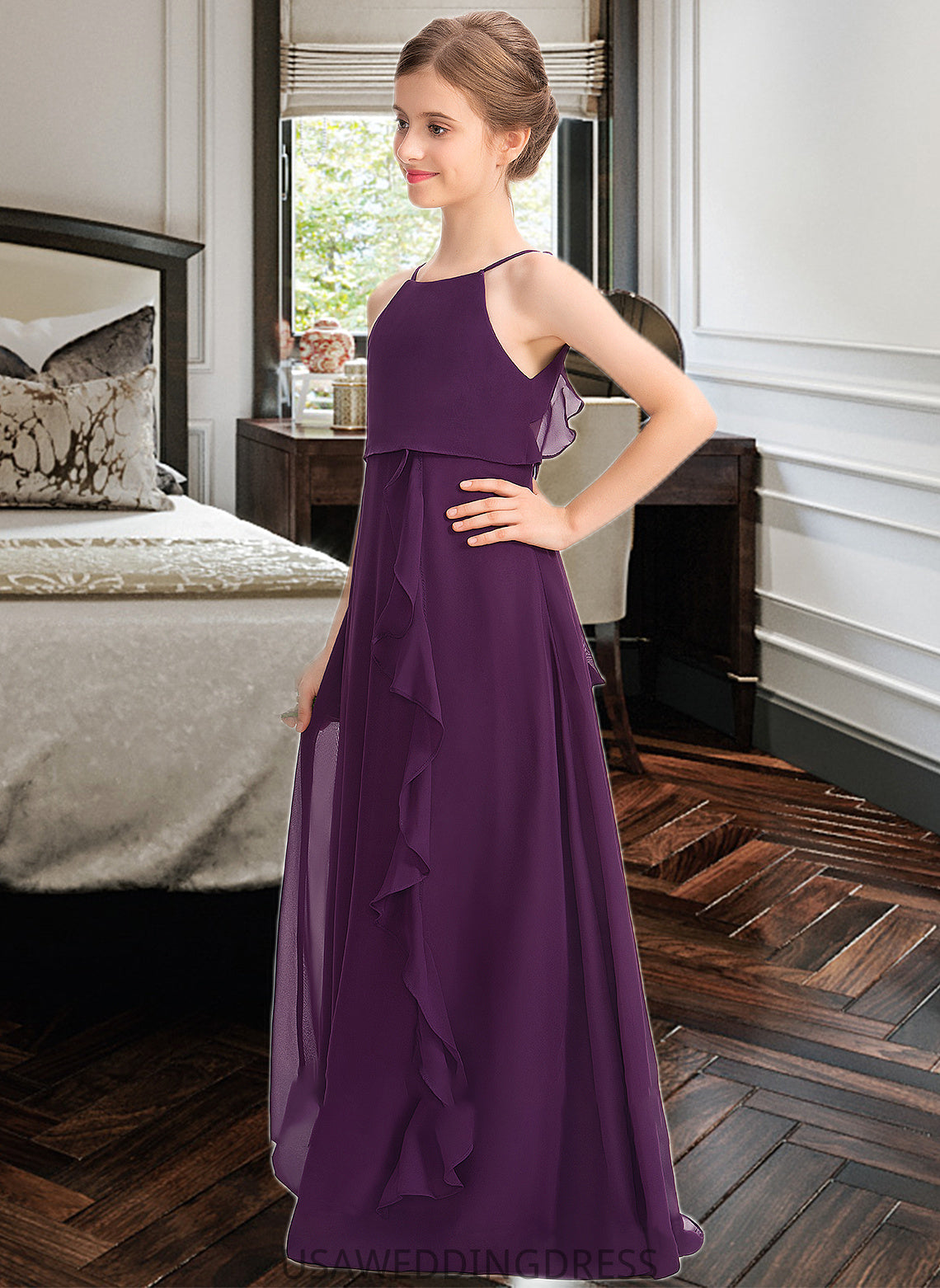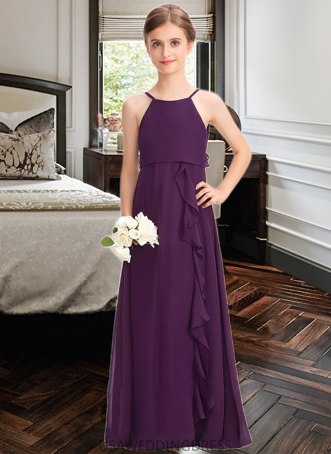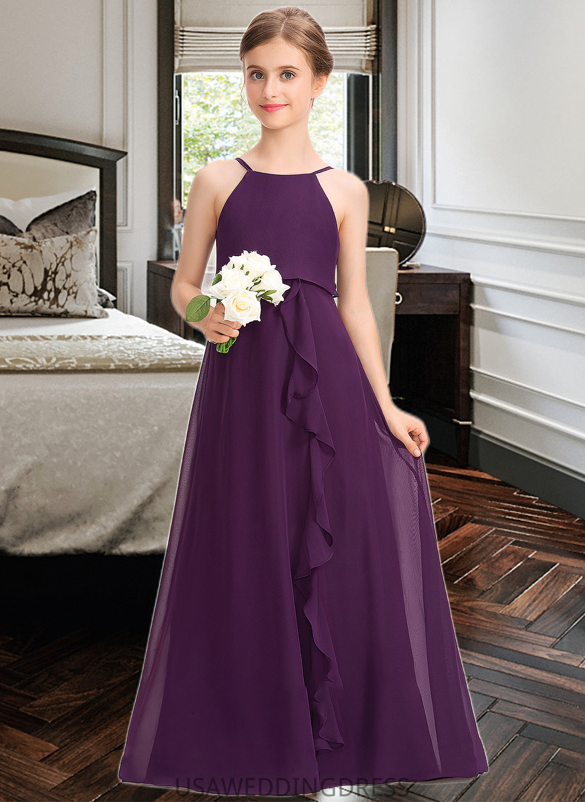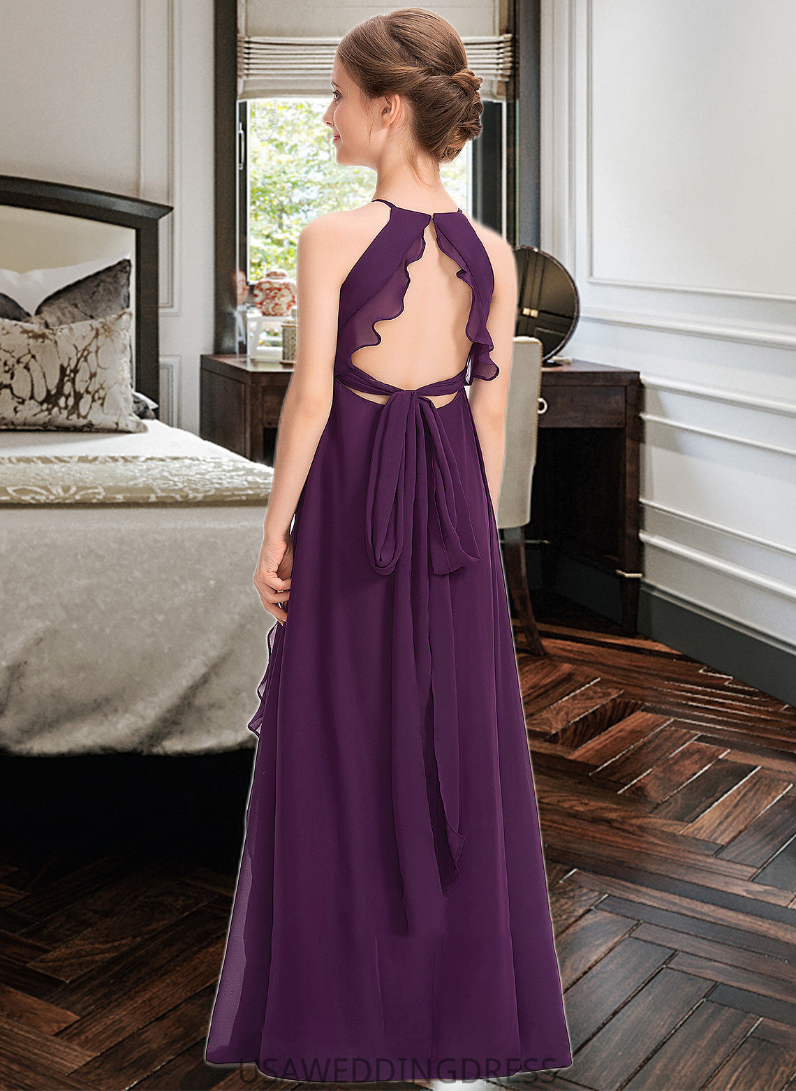 Abbie A-Line Scoop Neck Floor-Length Chiffon Junior Bridesmaid Dress With Bow(s) Cascading Ruffles DSP0013448