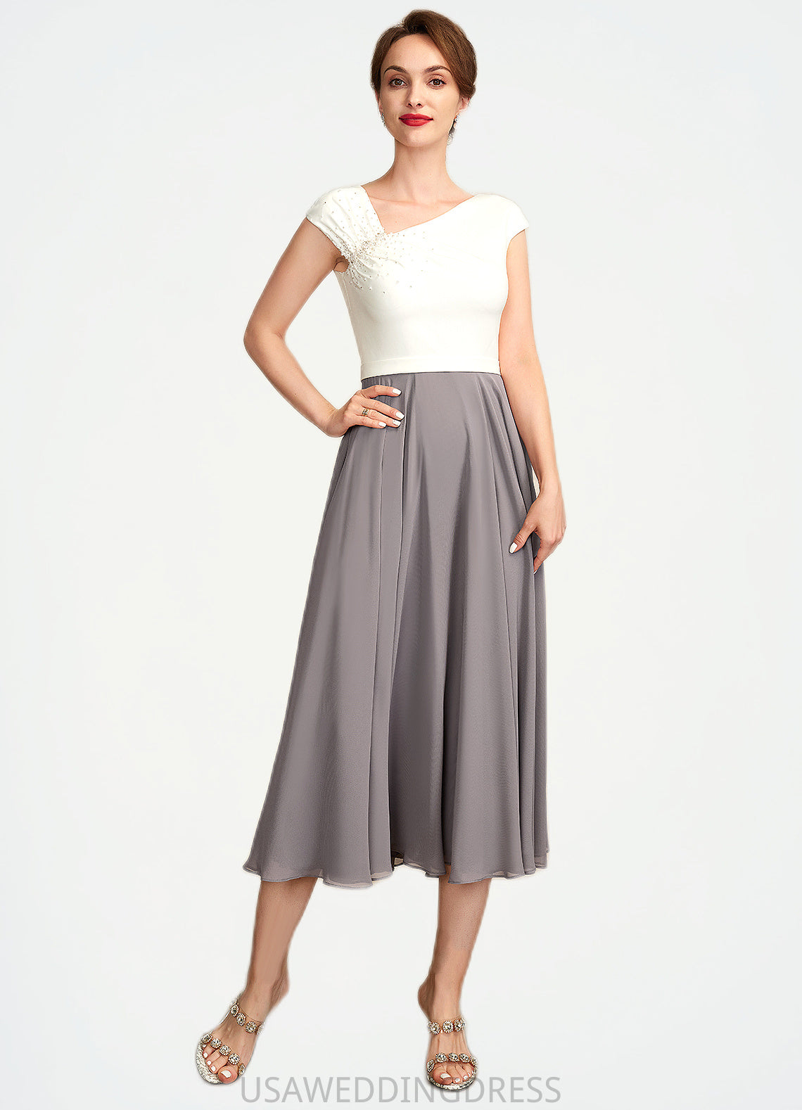 Abby A-Line V-neck Tea-Length Chiffon Mother of the Bride Dress With Ruffle Beading Sequins DS126P0015016