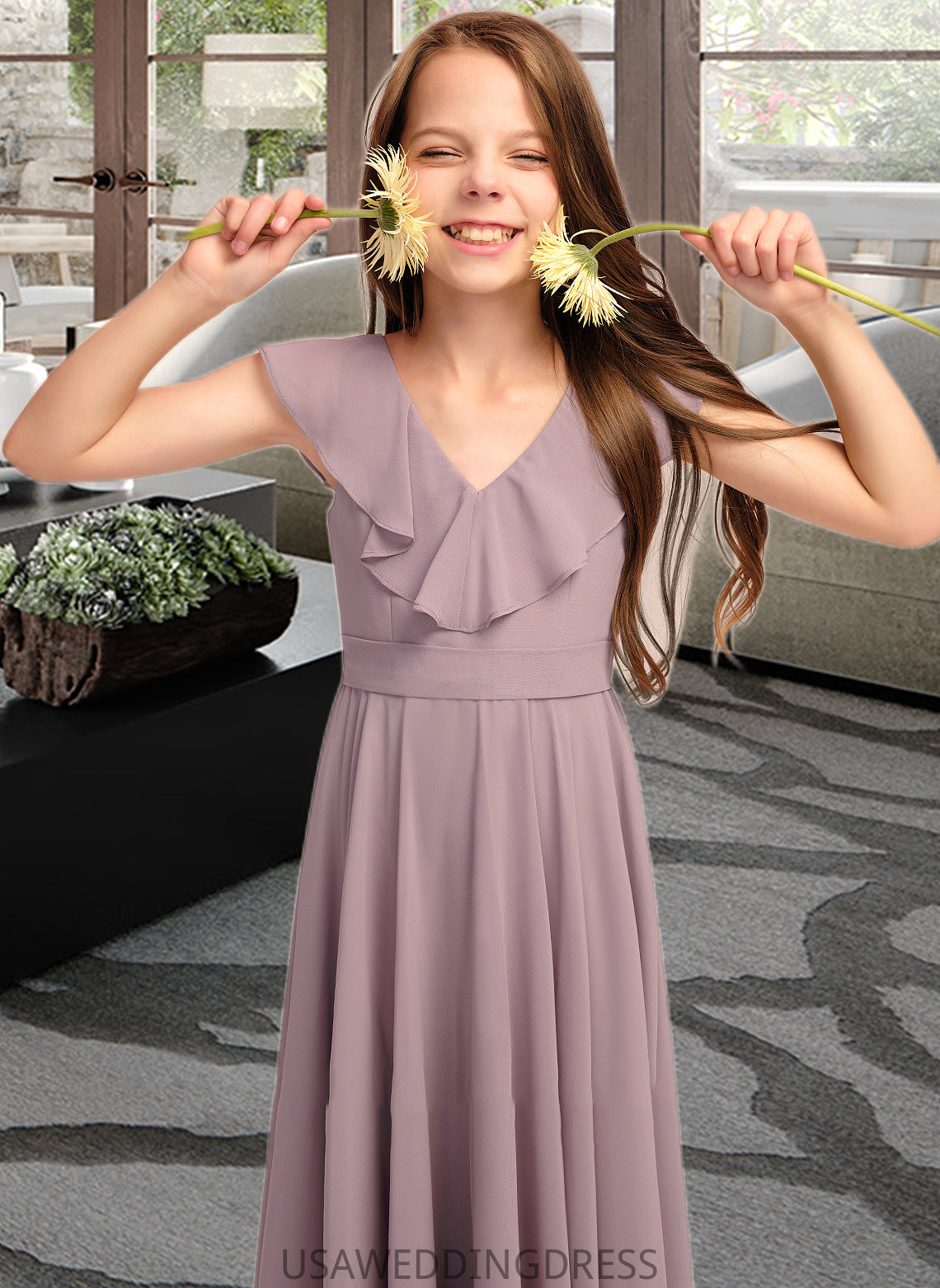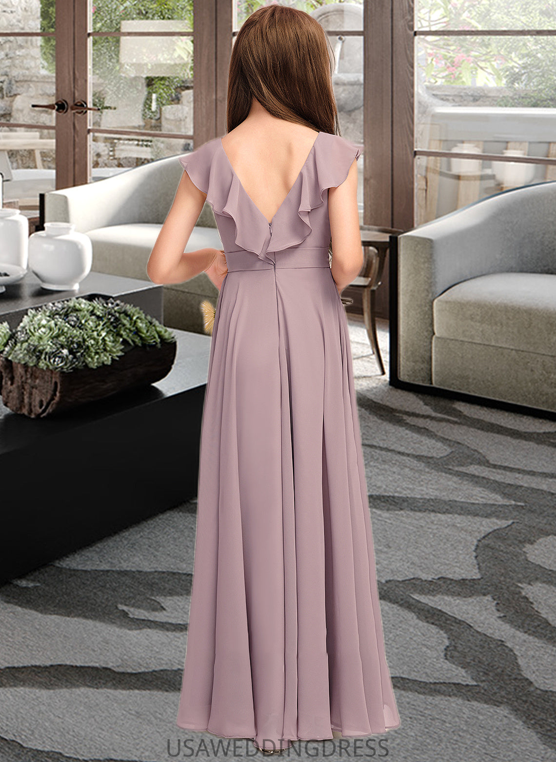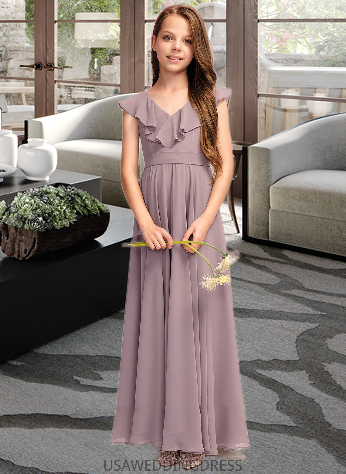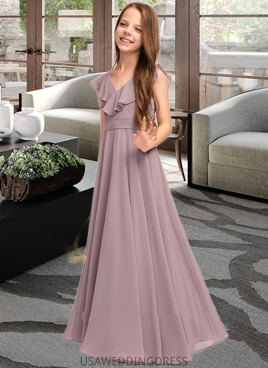 Adelaide A-Line V-neck Floor-Length Chiffon Junior Bridesmaid Dress With Cascading Ruffles DSP0013464