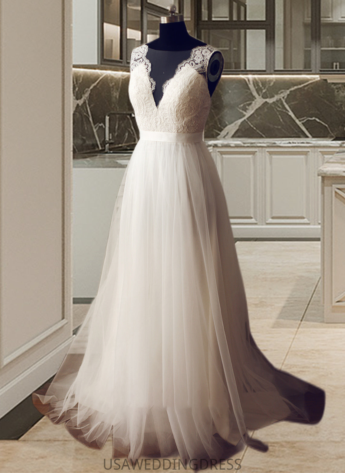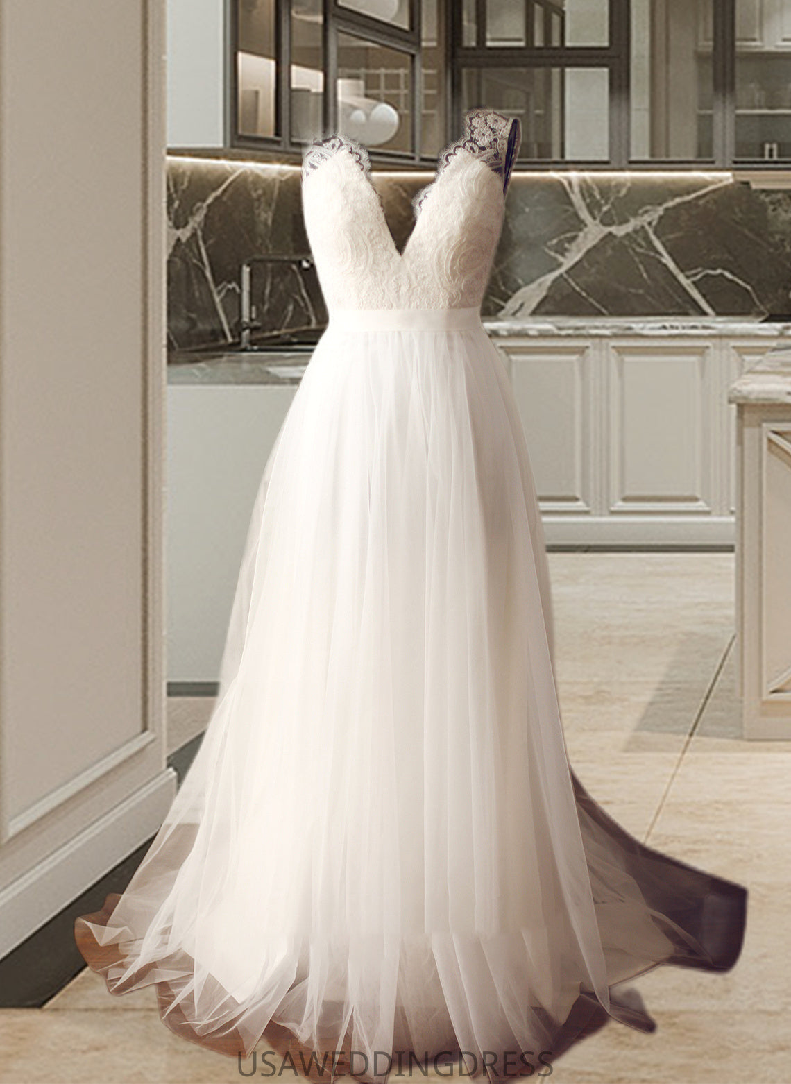 Adeline A-Line V-neck Sweep Train Tulle Wedding Dress DSP0013812