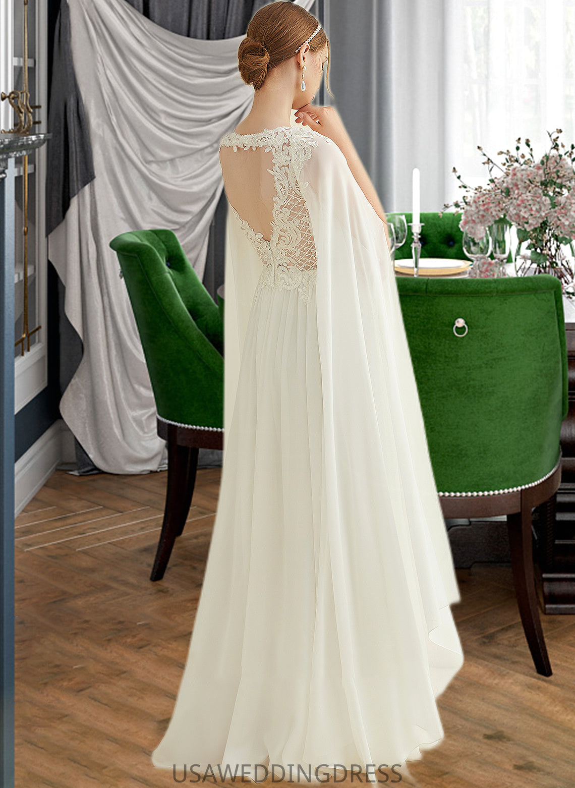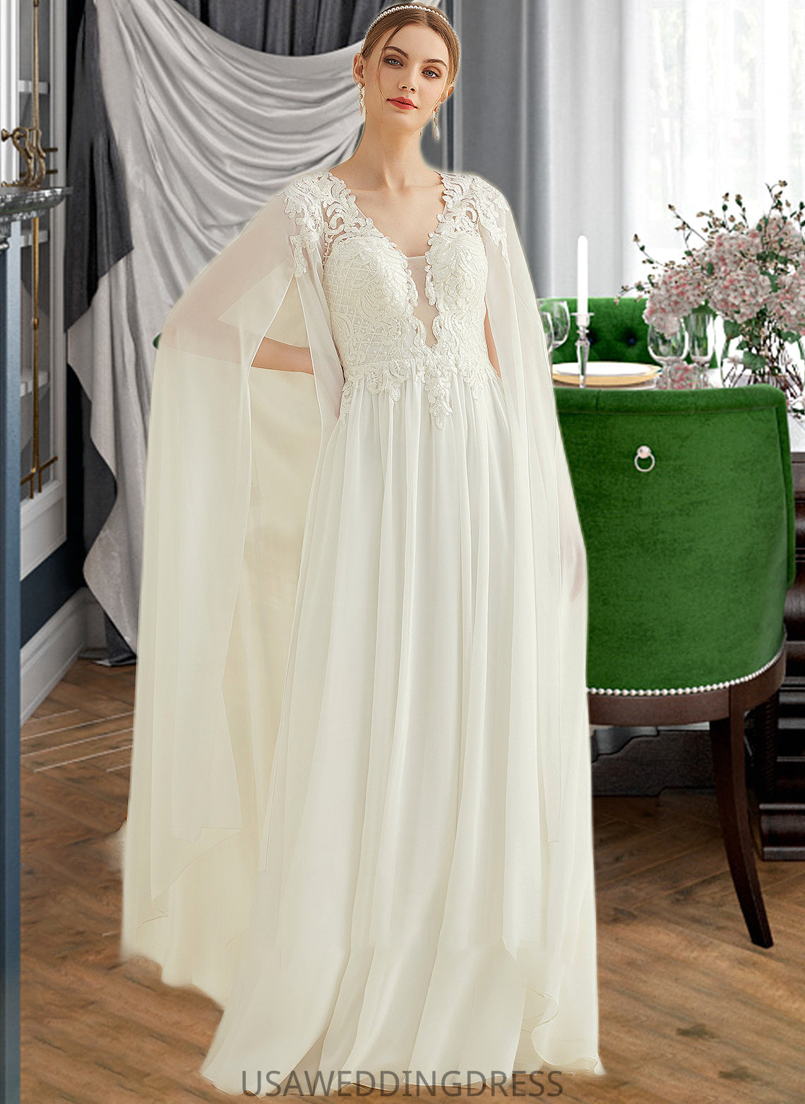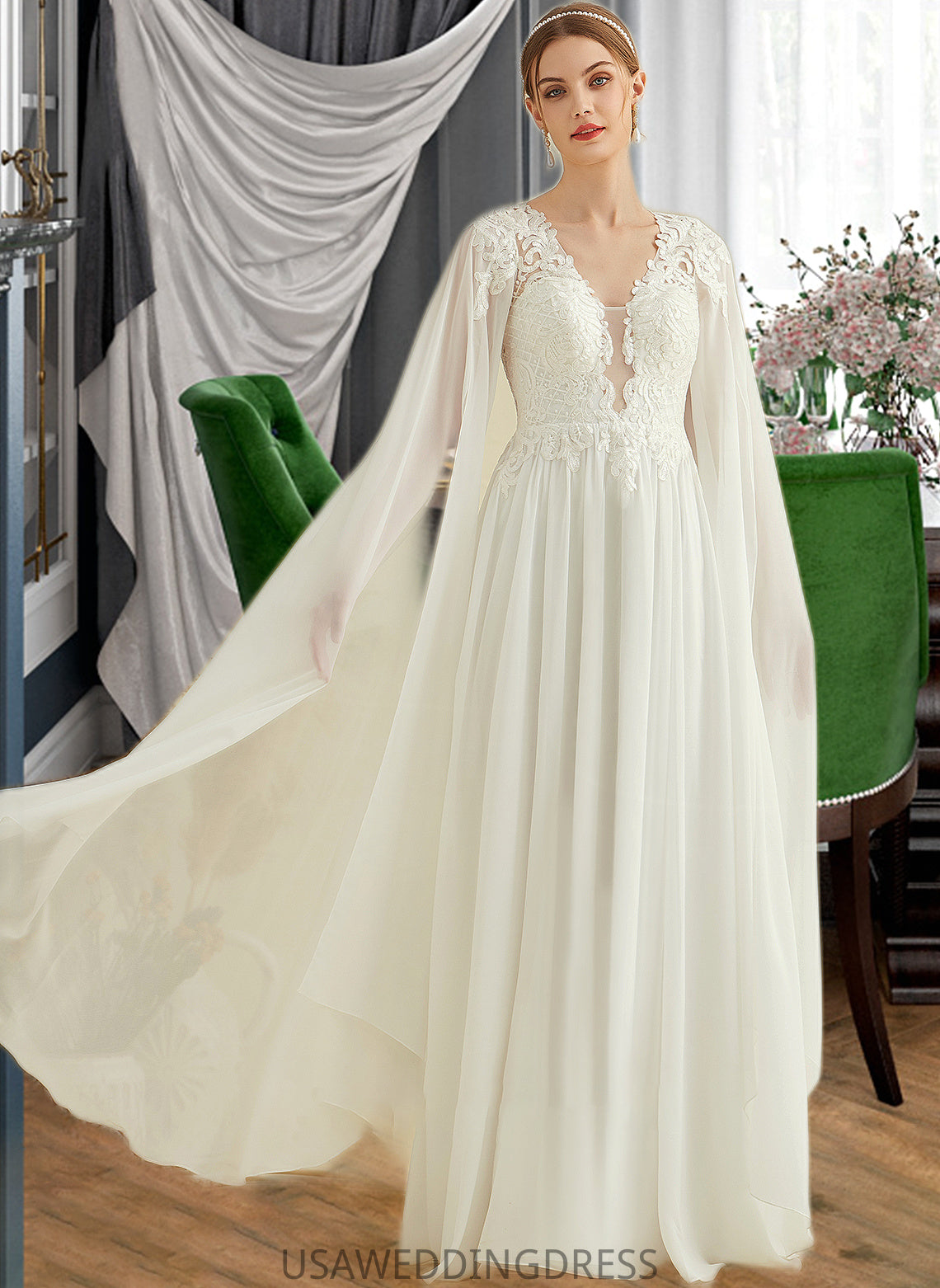 Adyson A-Line V-neck Floor-Length Chiffon Lace Wedding Dress With Sequins DSP0013736