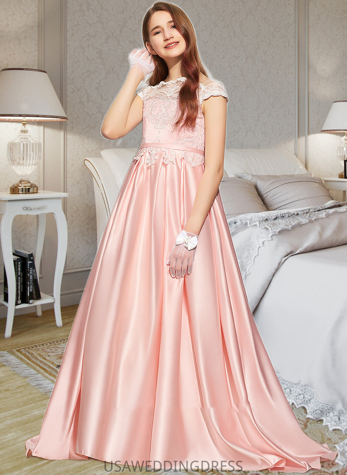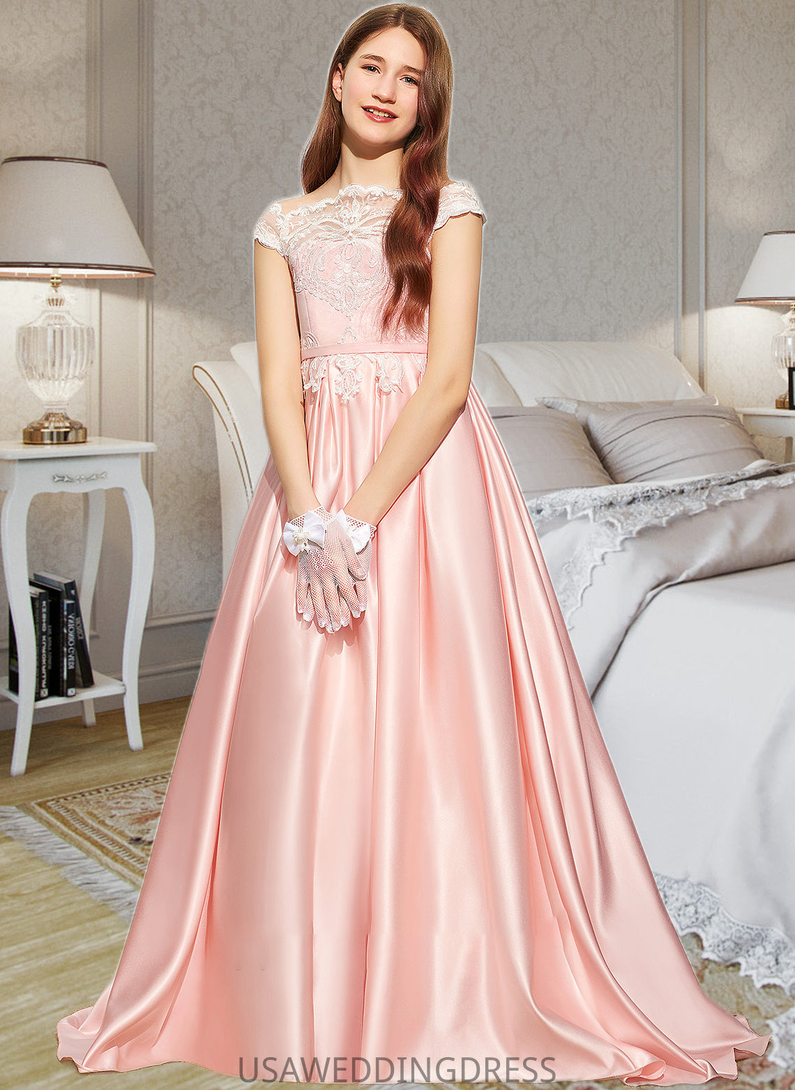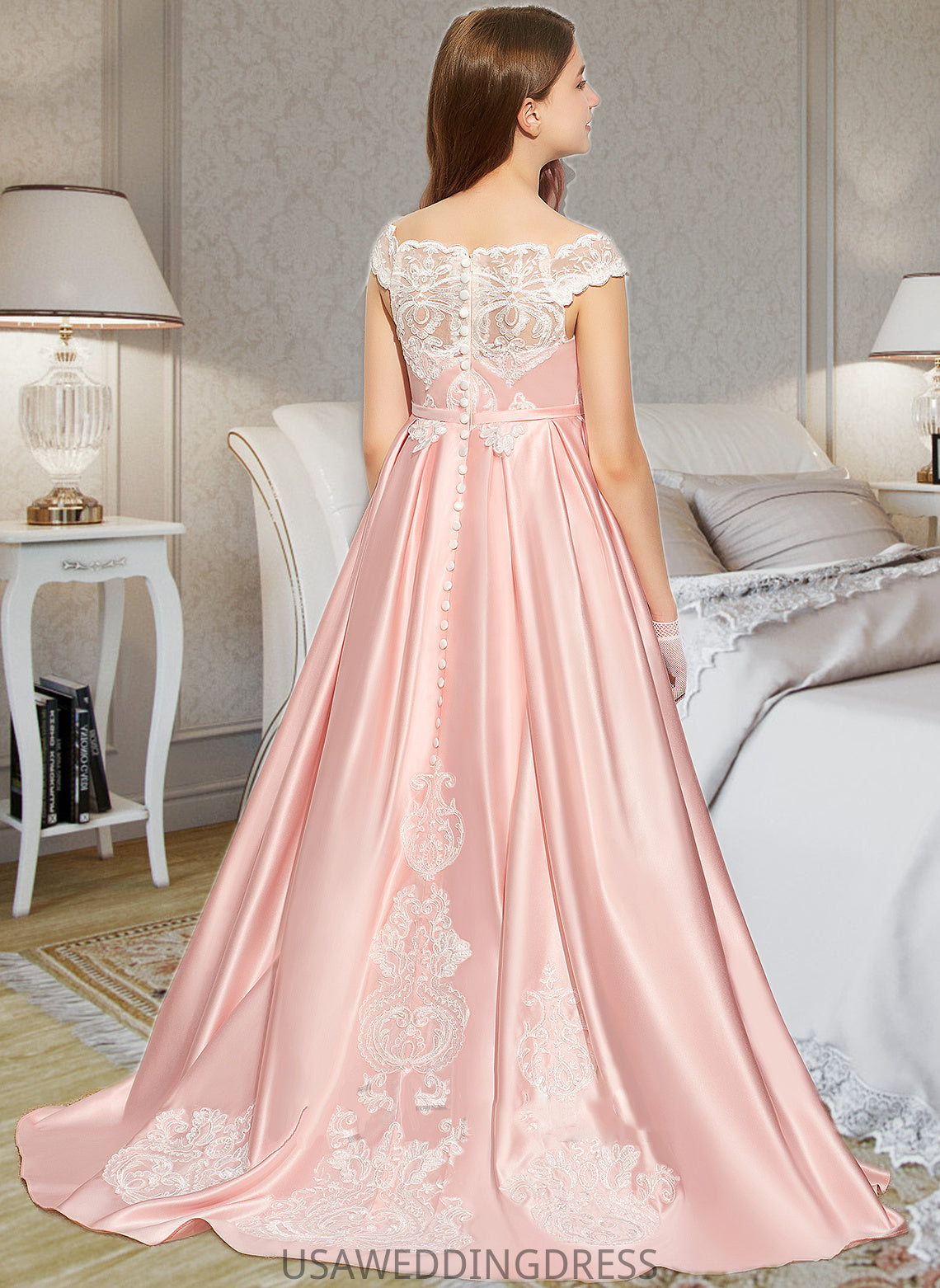Ainsley Ball-Gown/Princess Off-the-Shoulder Sweep Train Satin Lace Junior Bridesmaid Dress DSP0013460