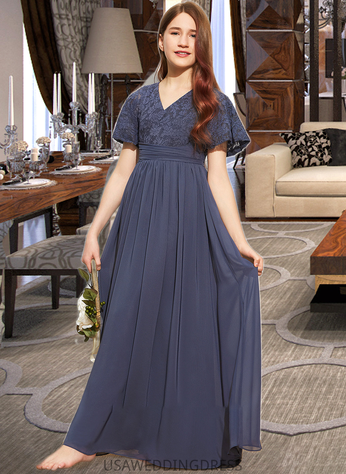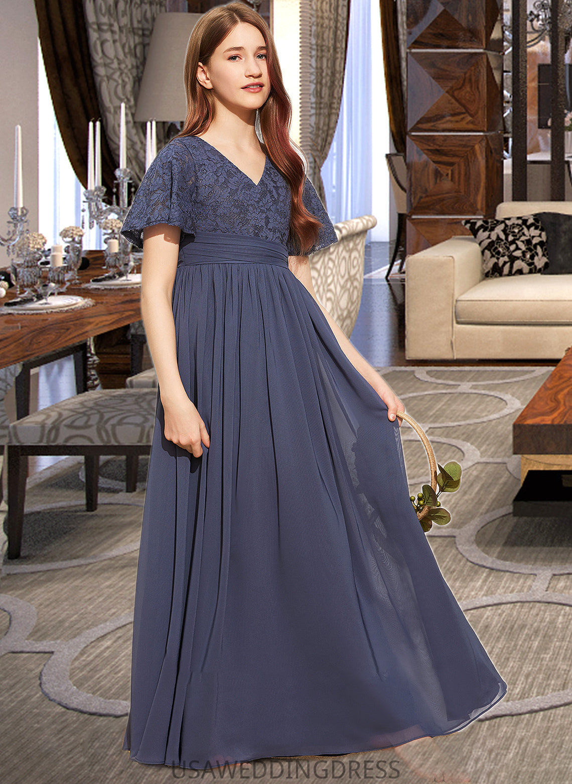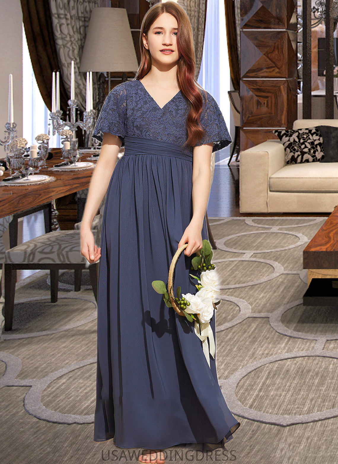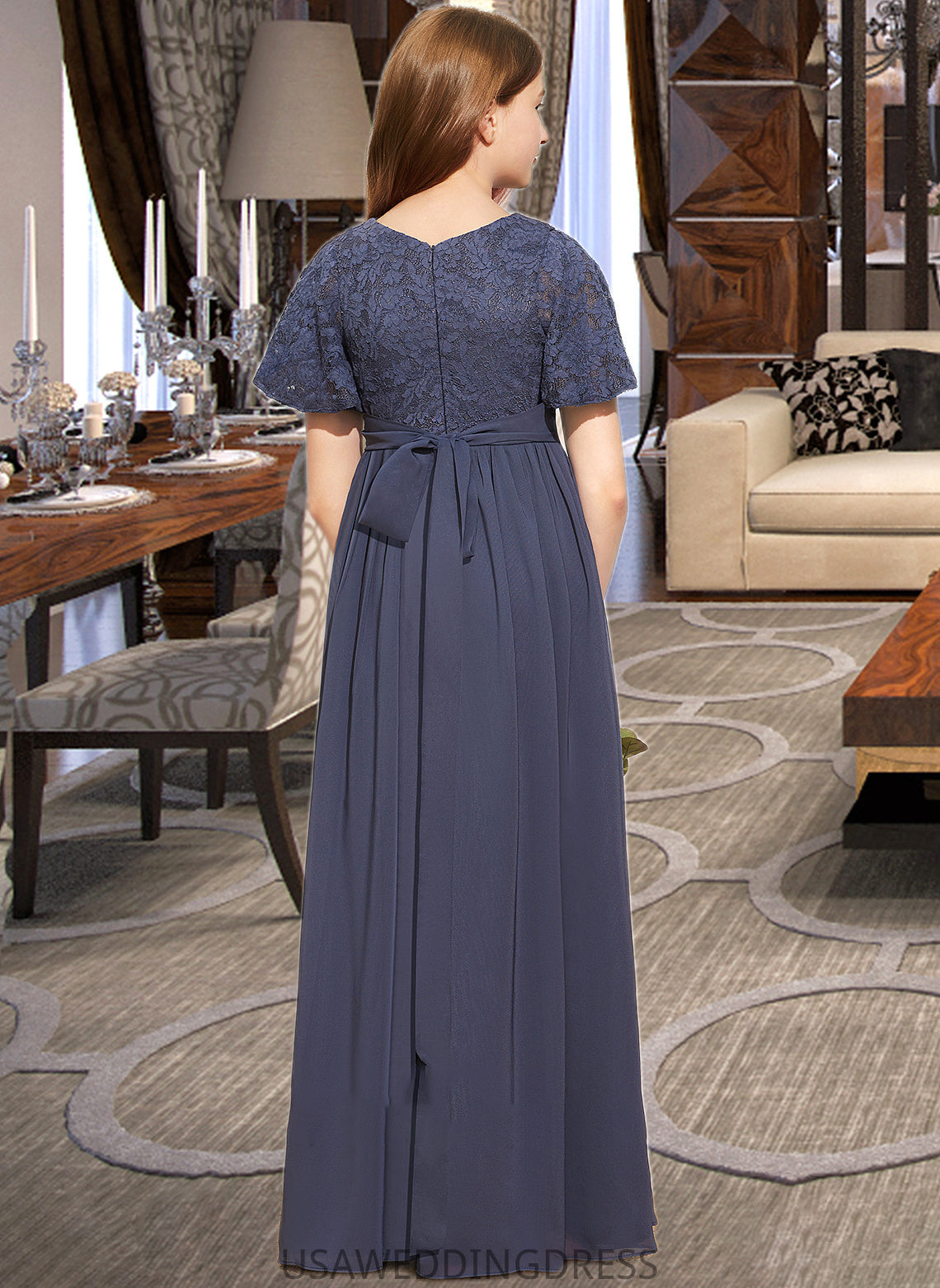 Allisson A-Line V-neck Floor-Length Chiffon Lace Junior Bridesmaid Dress With Bow(s) DSP0013523