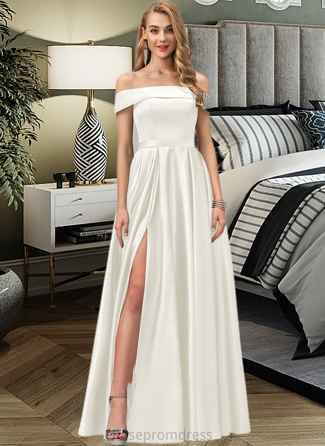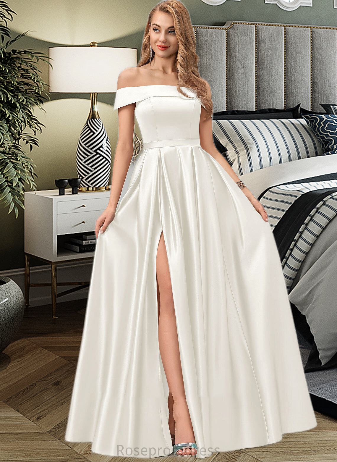 Alyssa Ball-Gown/Princess Off-the-Shoulder Floor-Length Satin Wedding Dress With Split Front Pockets SRSP0013774