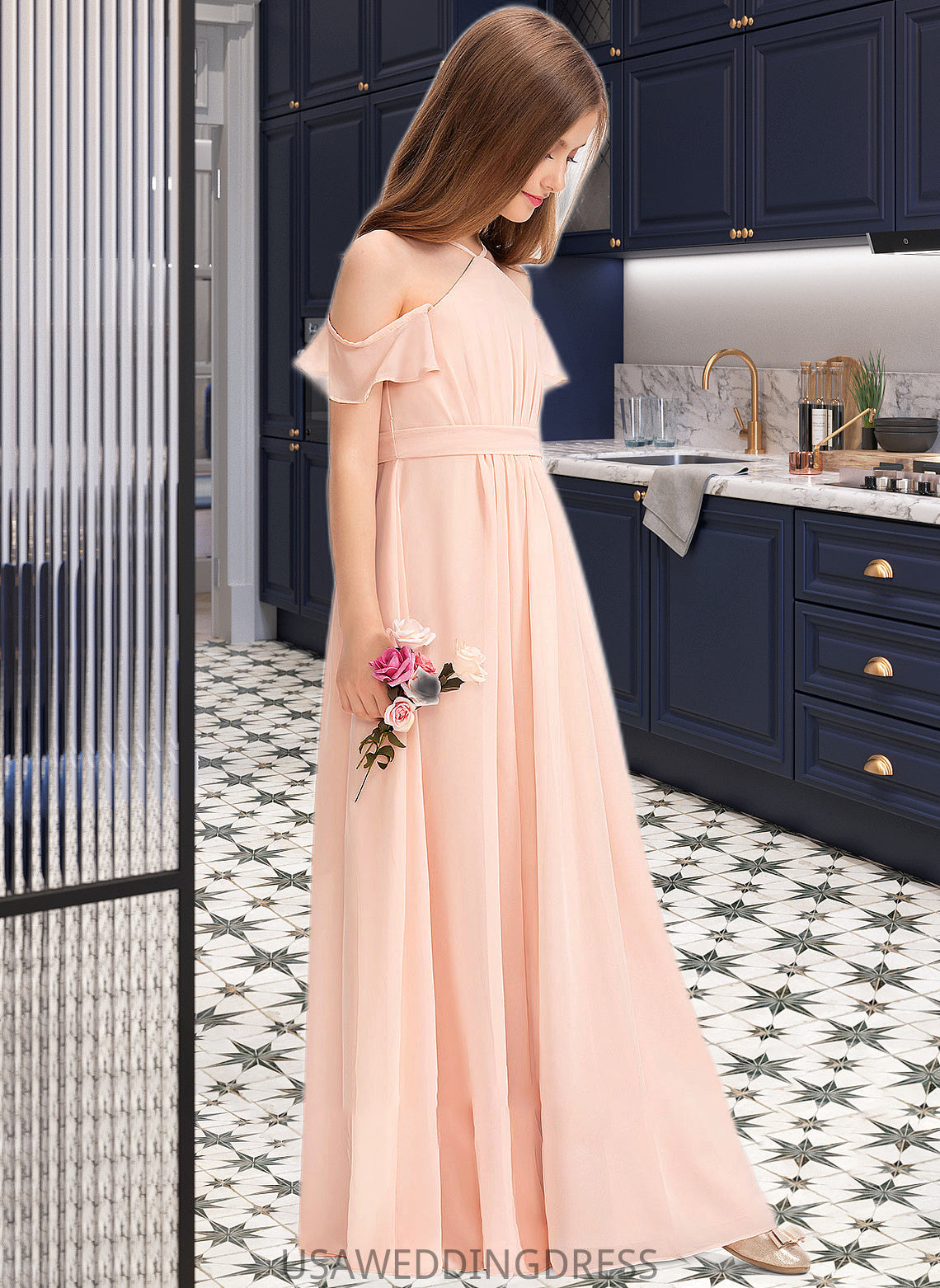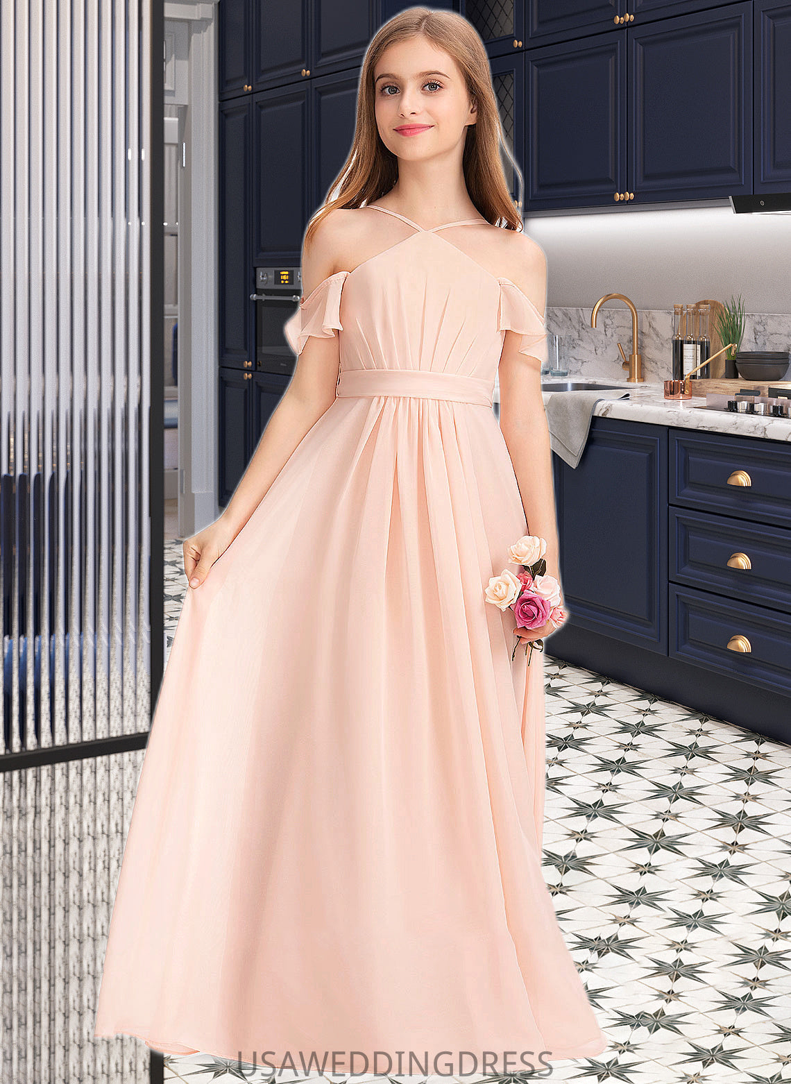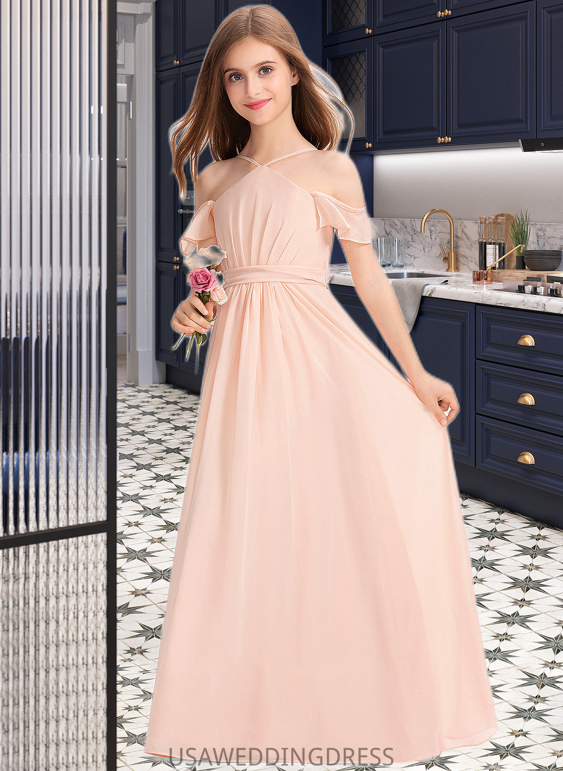 Amani A-Line V-neck Floor-Length Chiffon Junior Bridesmaid Dress With Ruffle Bow(s) DSP0013349