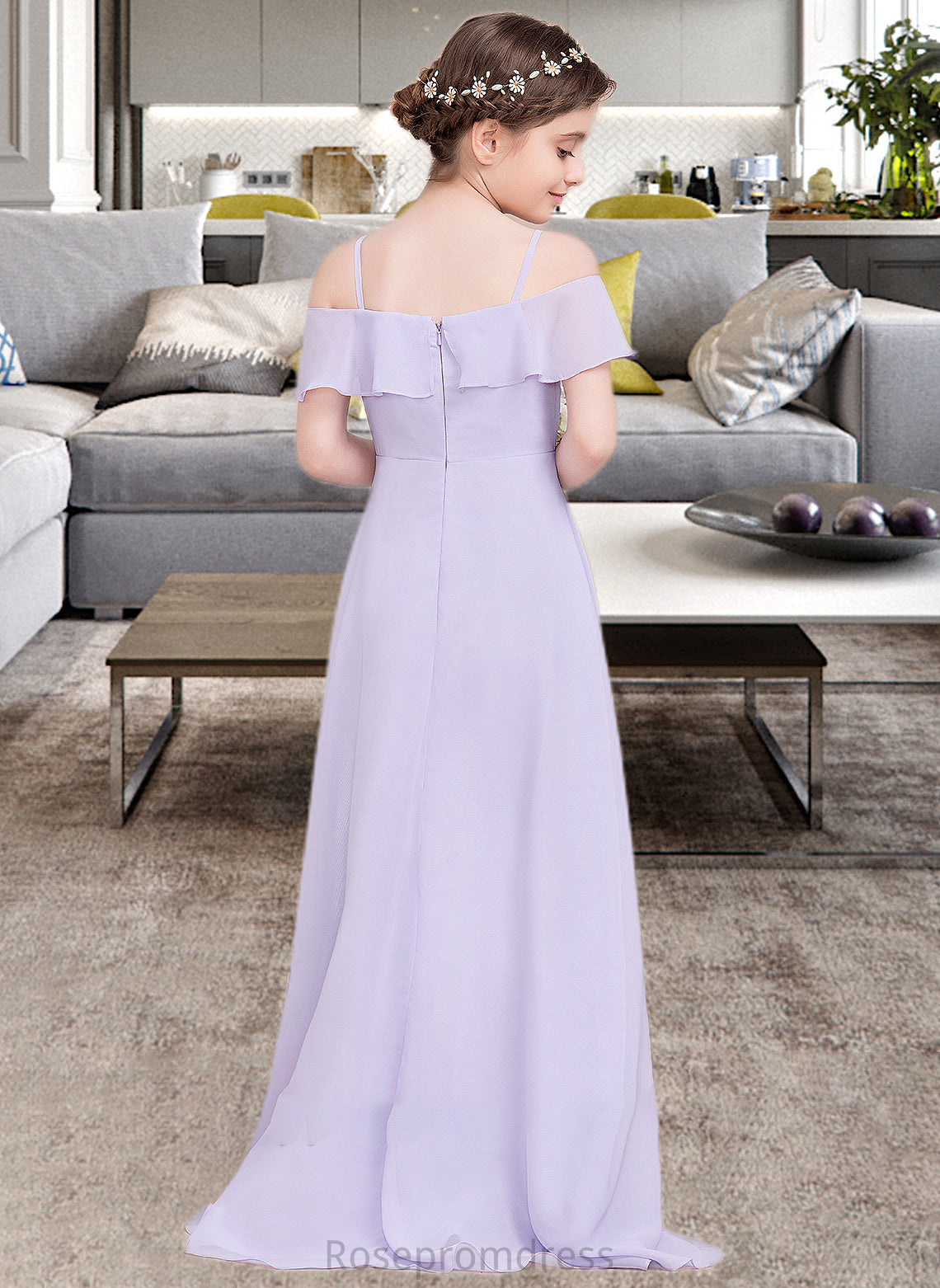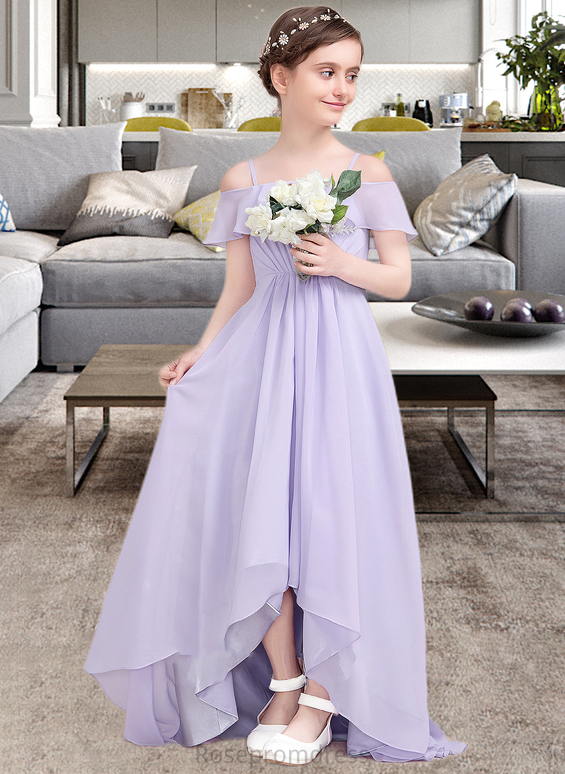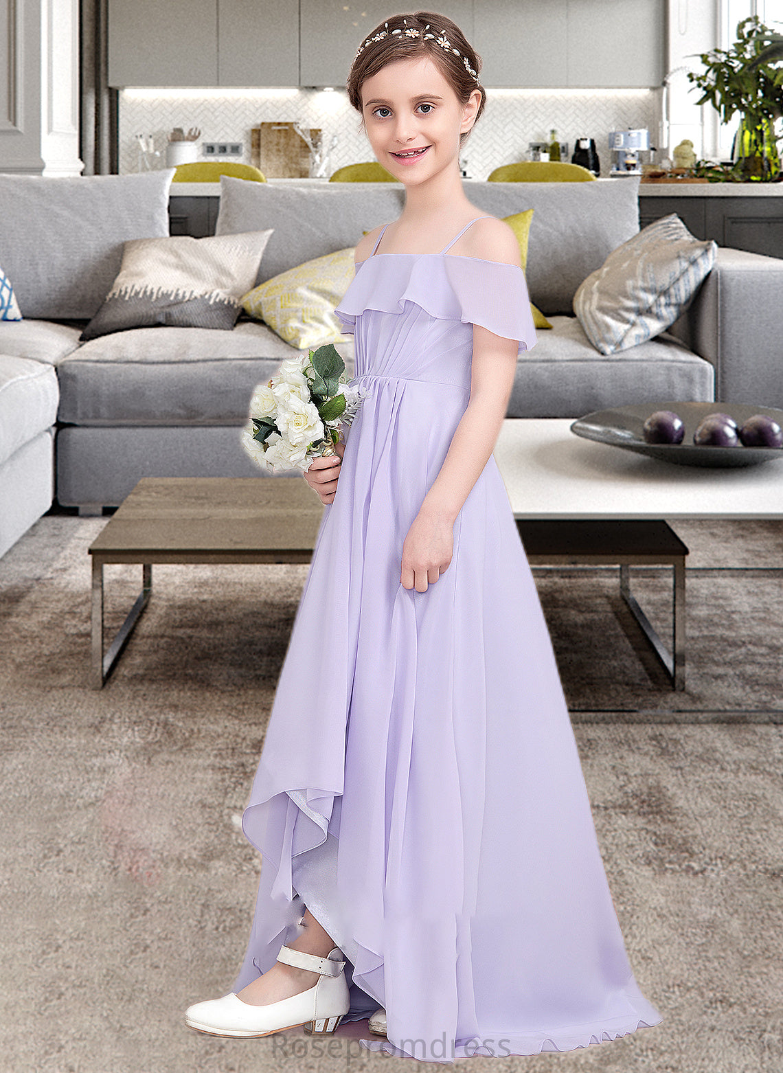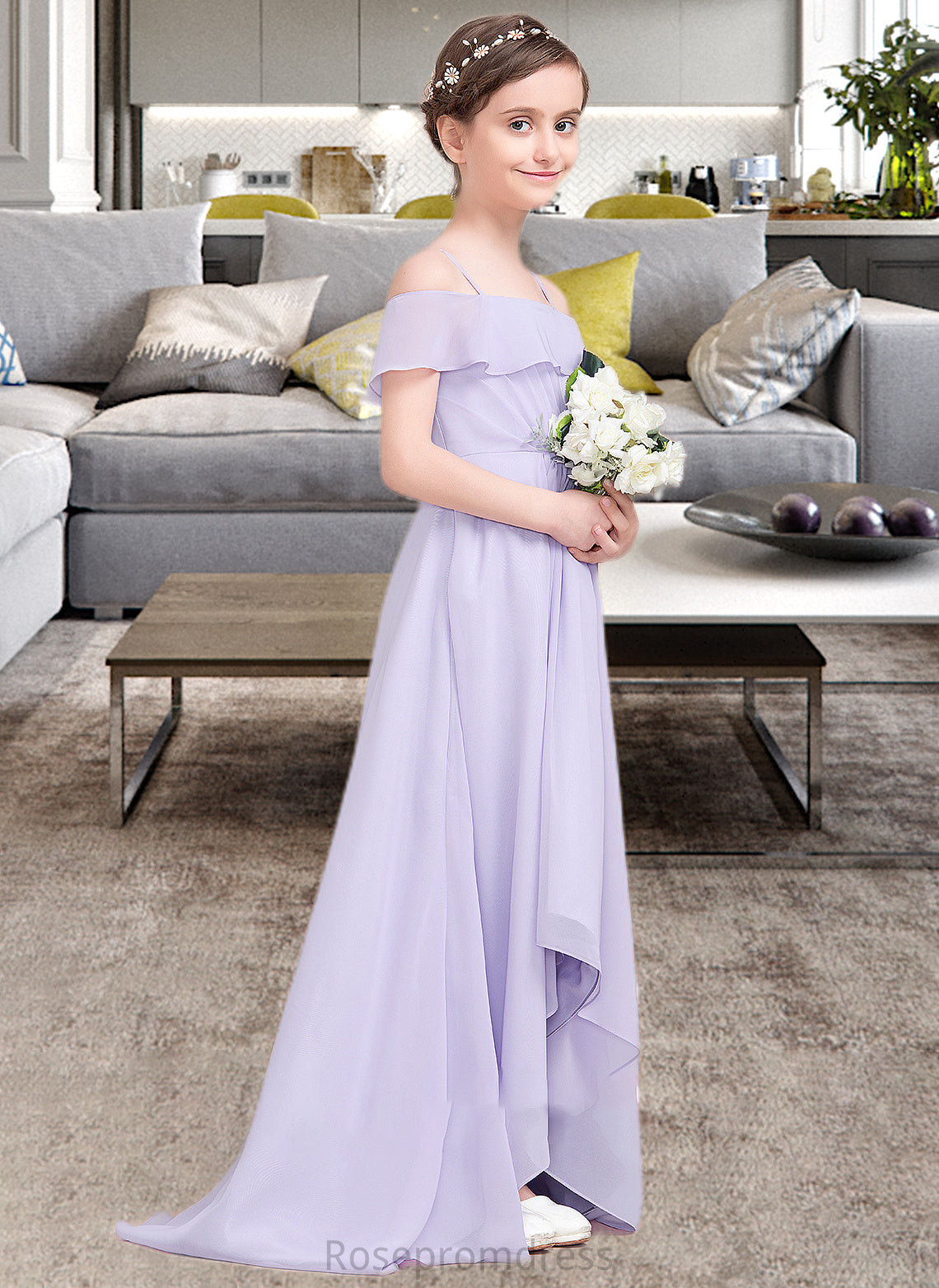 Amelie A-Line Off-the-Shoulder Asymmetrical Chiffon Junior Bridesmaid Dress With Cascading Ruffles SRSP0013566