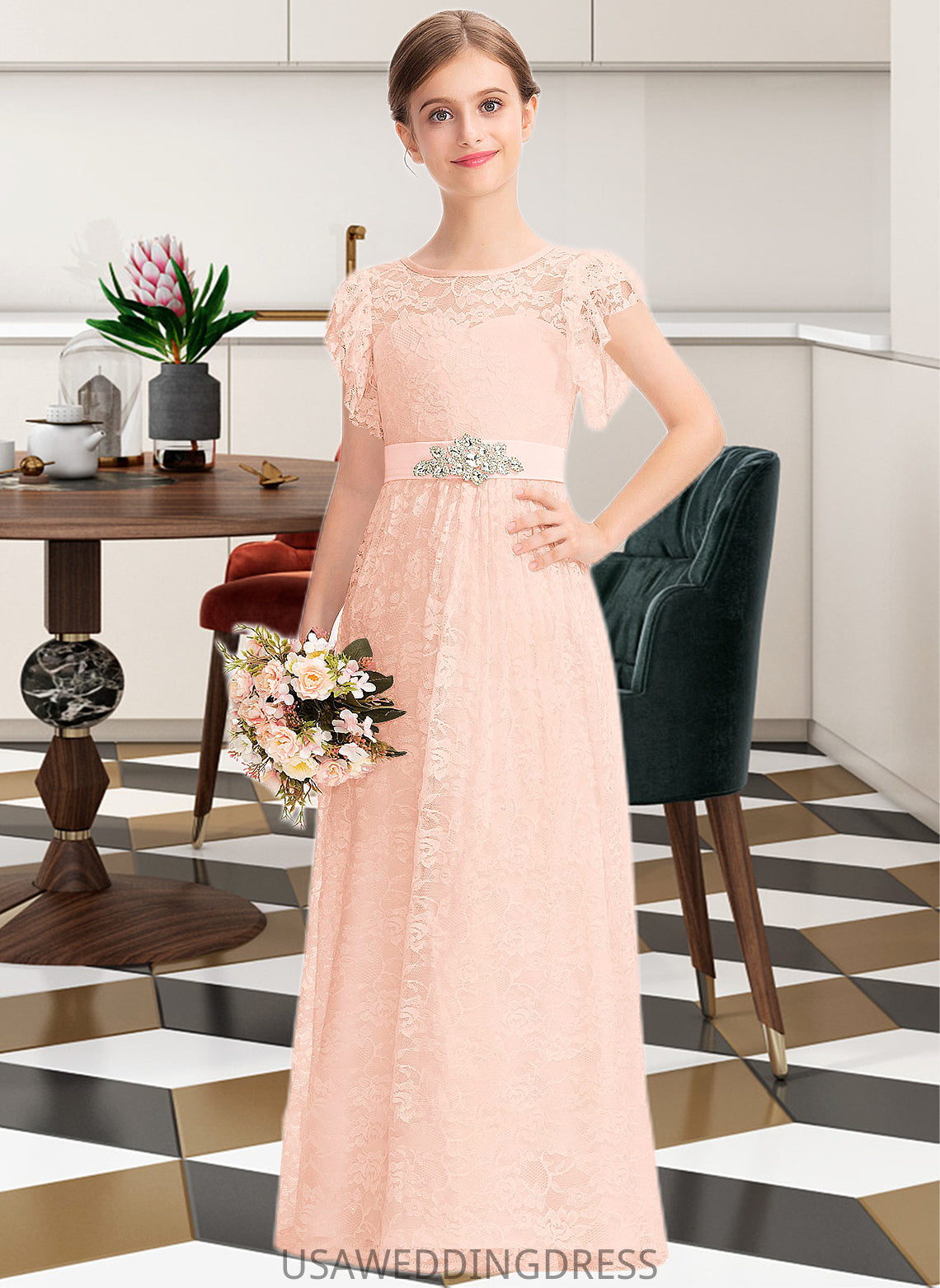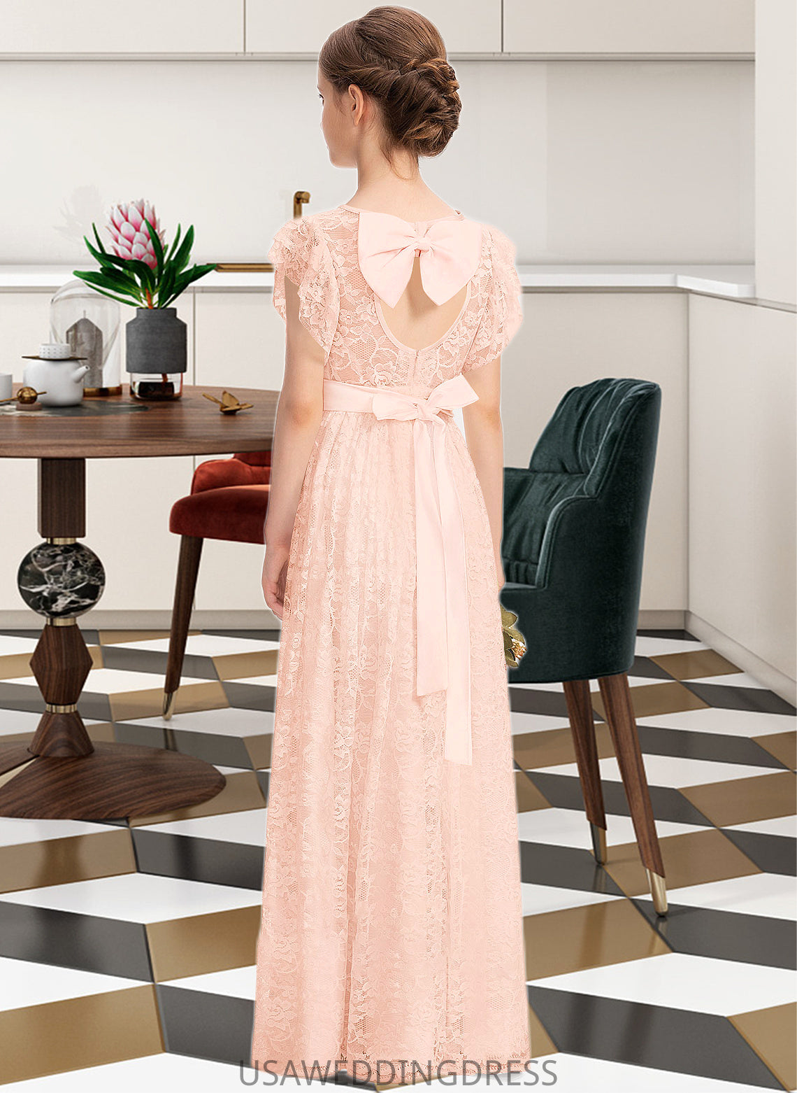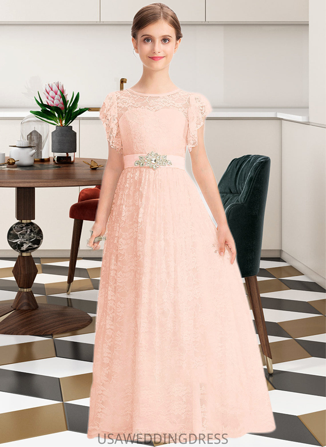 America A-Line Scoop Neck Floor-Length Lace Junior Bridesmaid Dress With Beading Bow(s) Cascading Ruffles DSP0013627