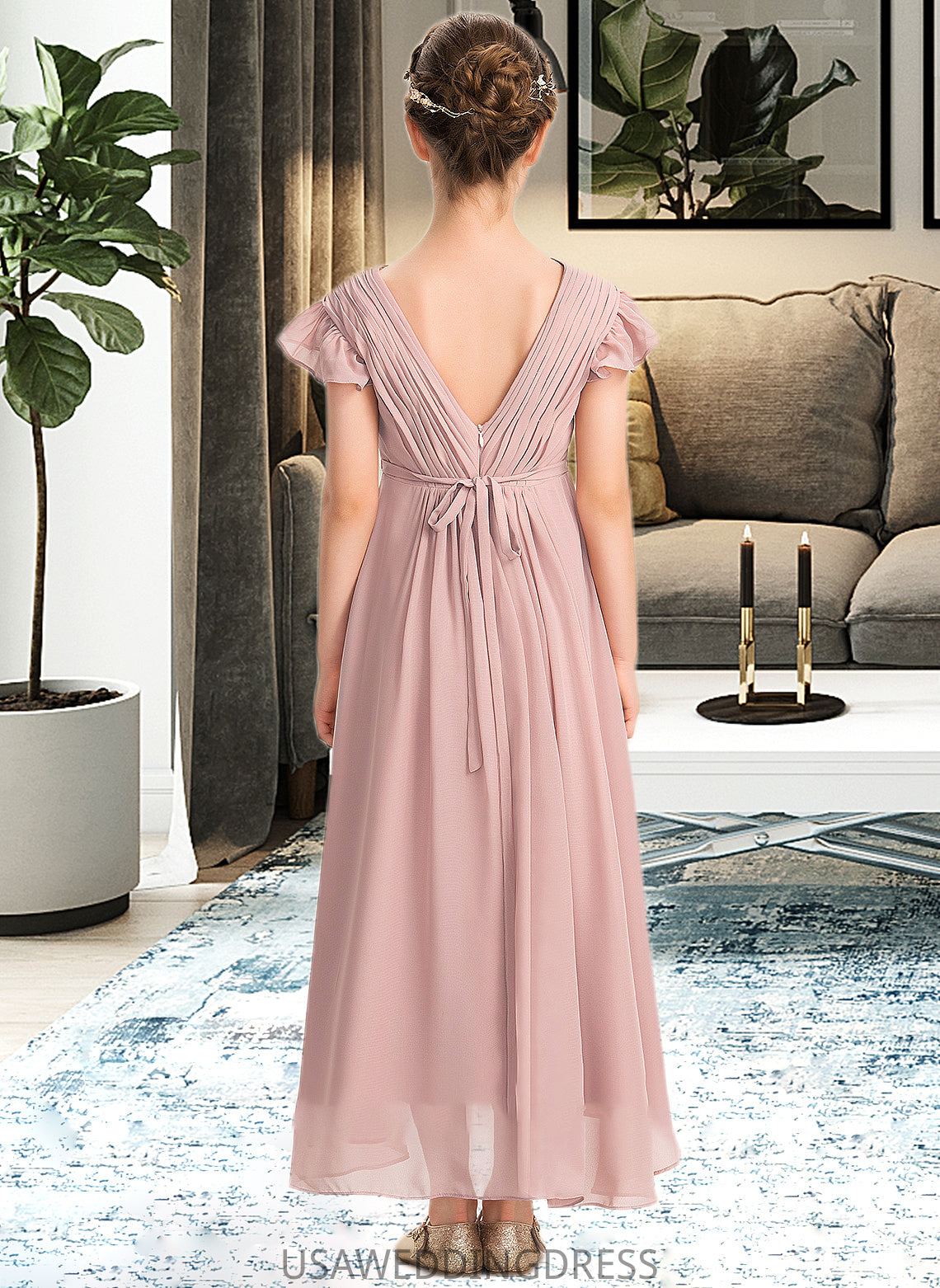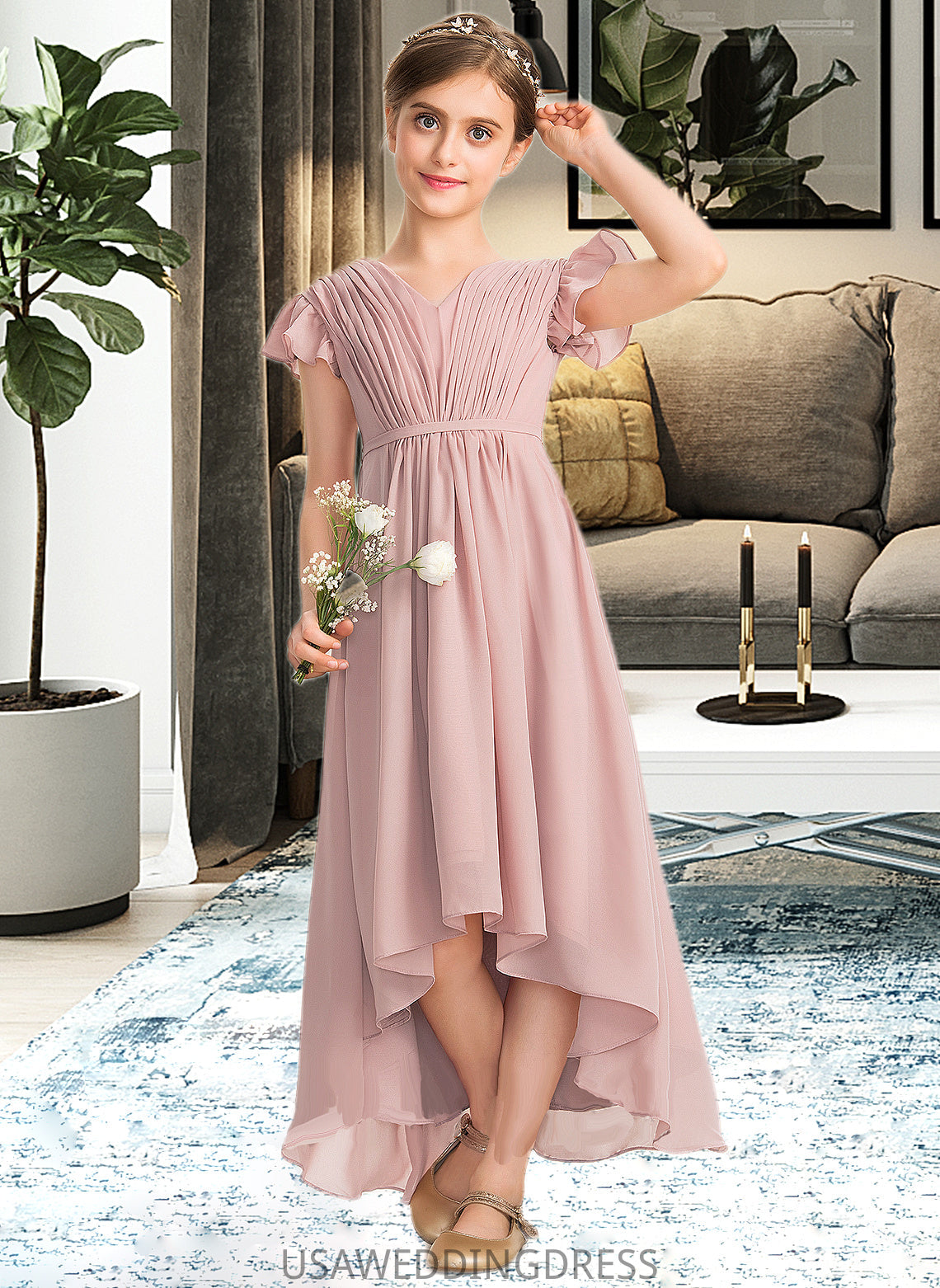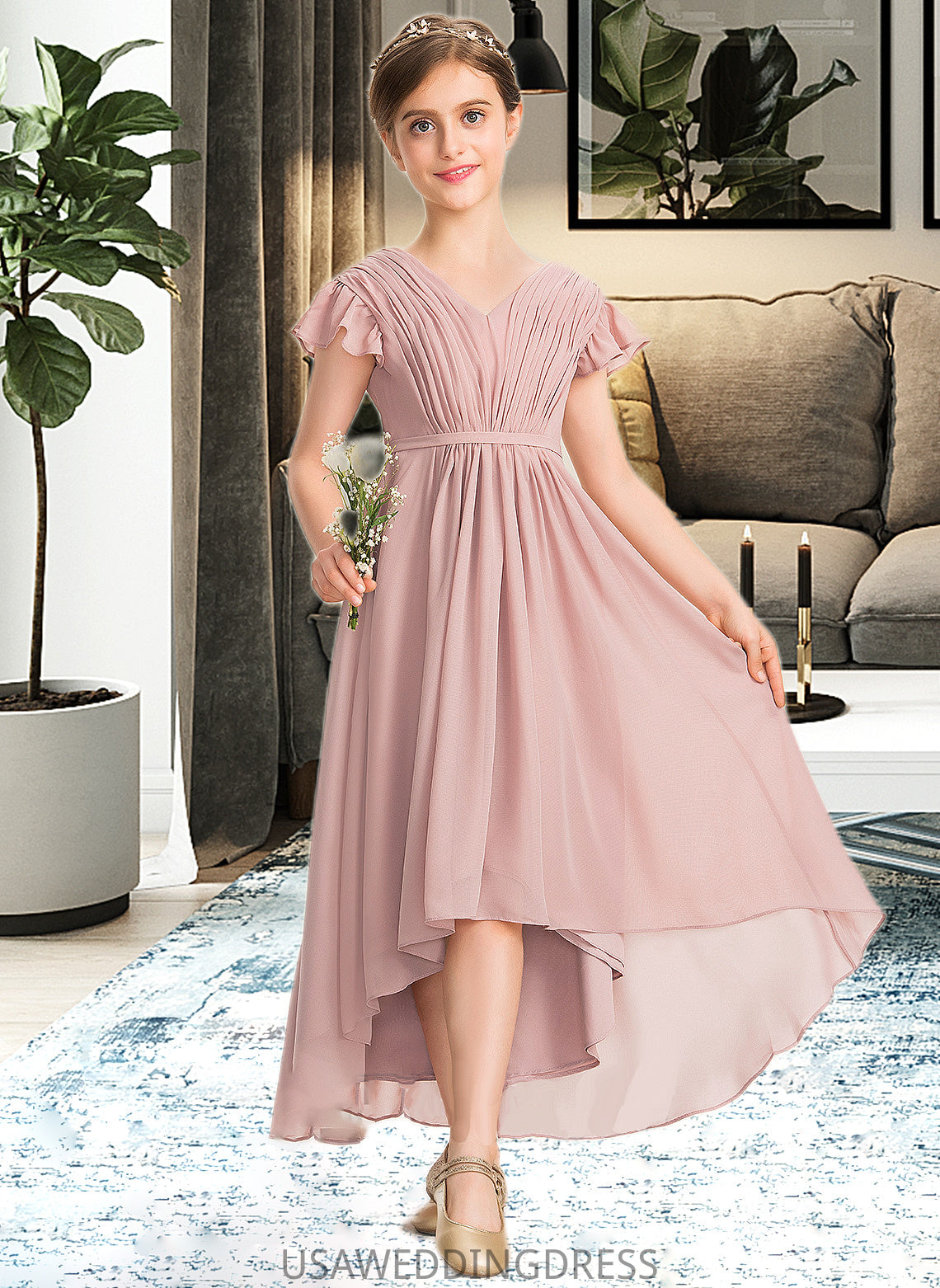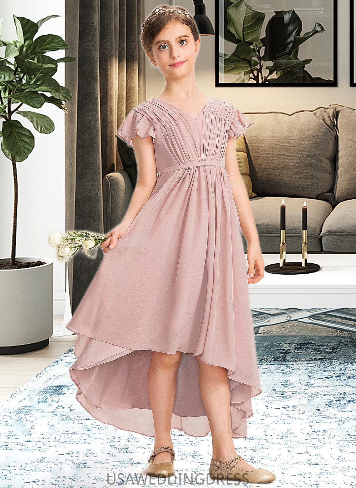 Ariel A-Line V-neck Asymmetrical Chiffon Junior Bridesmaid Dress With Bow(s) Cascading Ruffles DSP0013496