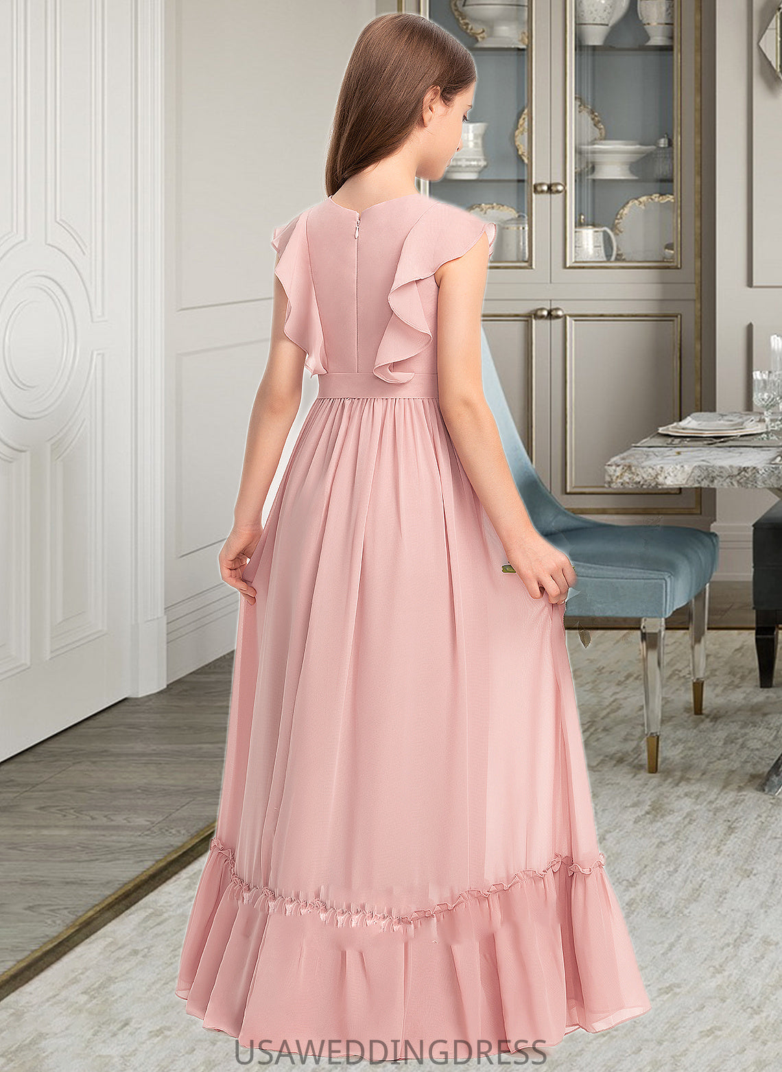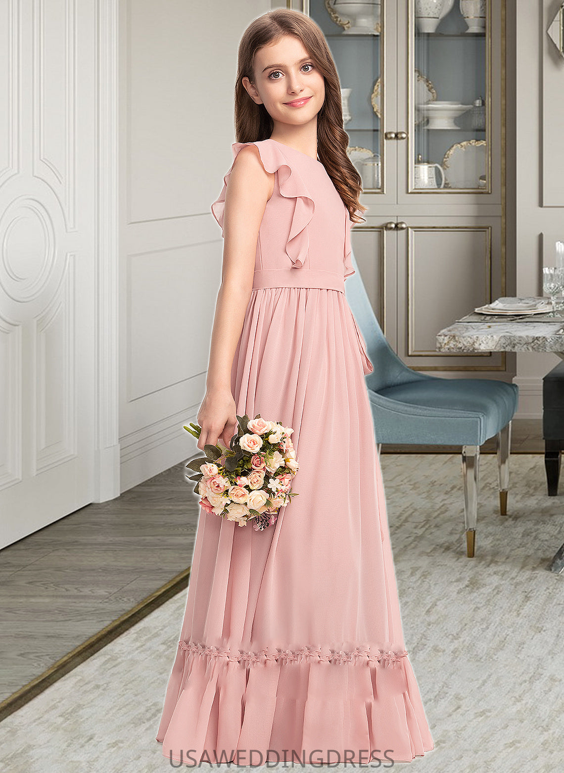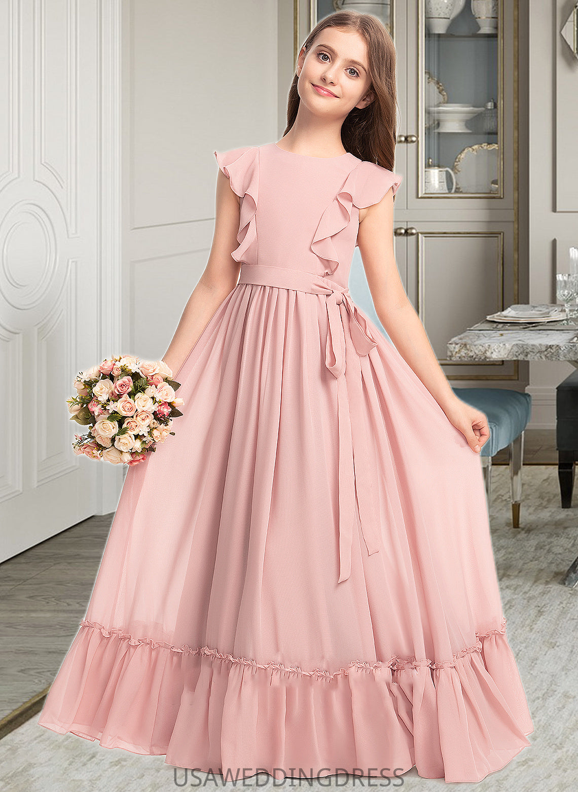Aspen A-Line Scoop Neck Floor-Length Chiffon Junior Bridesmaid Dress With Bow(s) Cascading Ruffles DSP0013375