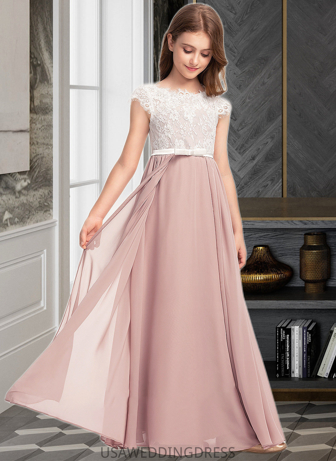Aubree A-Line Scoop Neck Floor-Length Chiffon Lace Junior Bridesmaid Dress With Bow(s) DSP0013305