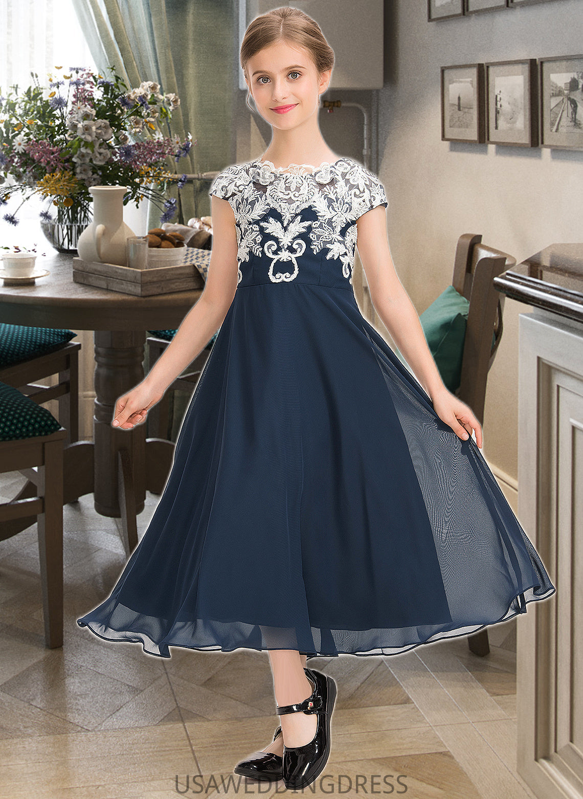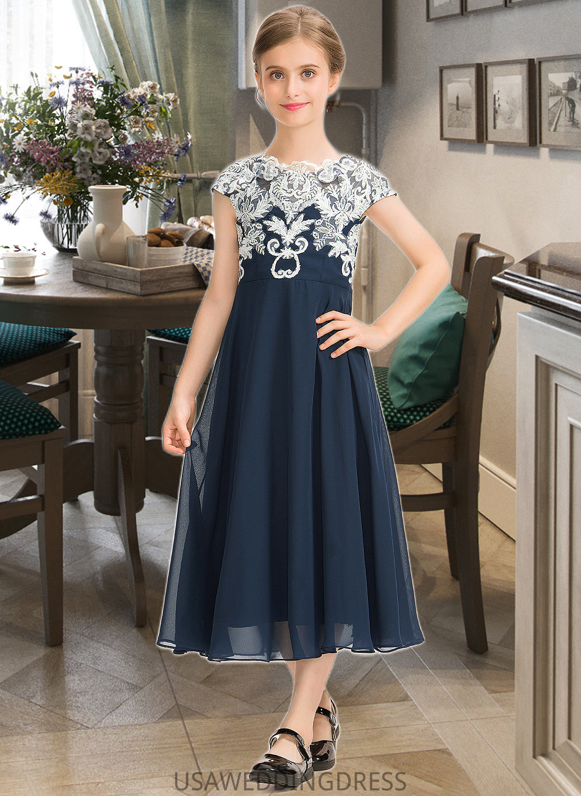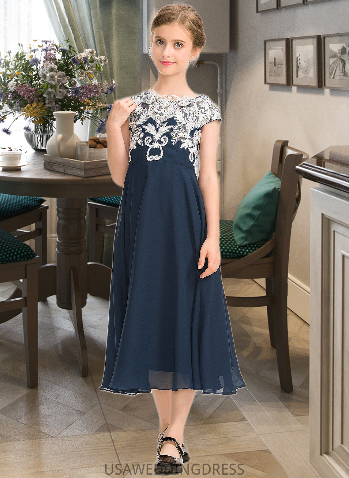 Aubree A-Line Scoop Neck Tea-Length Chiffon Lace Junior Bridesmaid Dress DSP0013643