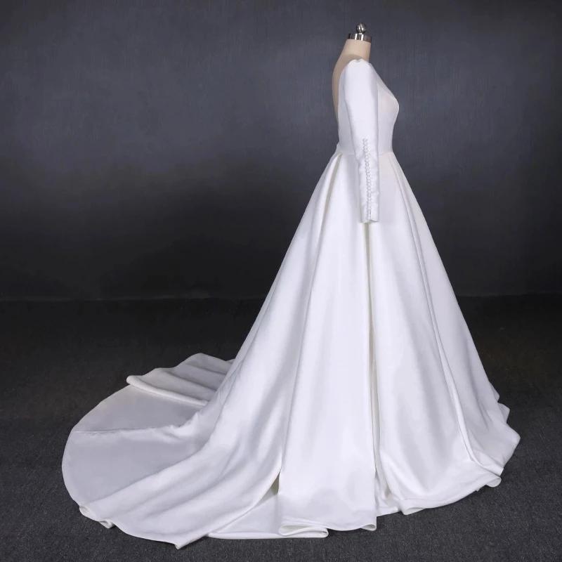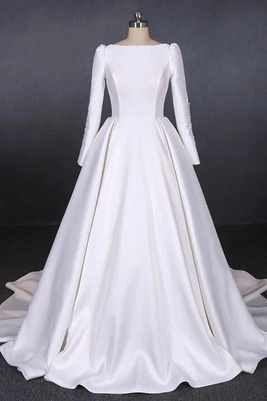 Ball Gown Long Sleeve White Satin Wedding Dresses, Long Simple Wedding Gowns SRS15060
