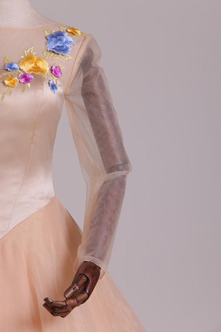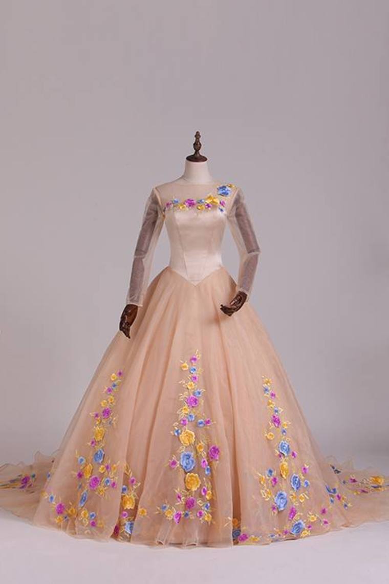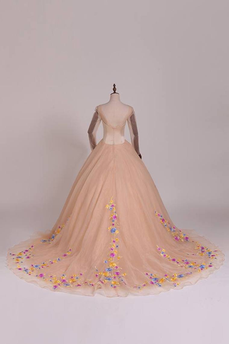 Ball Gown Long Sleeves Scoop Tulle Wedding Dress, Princess Long Bridal Dress With Appliques