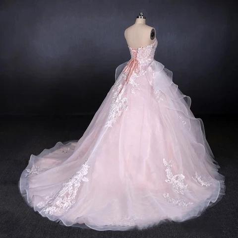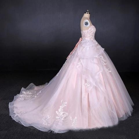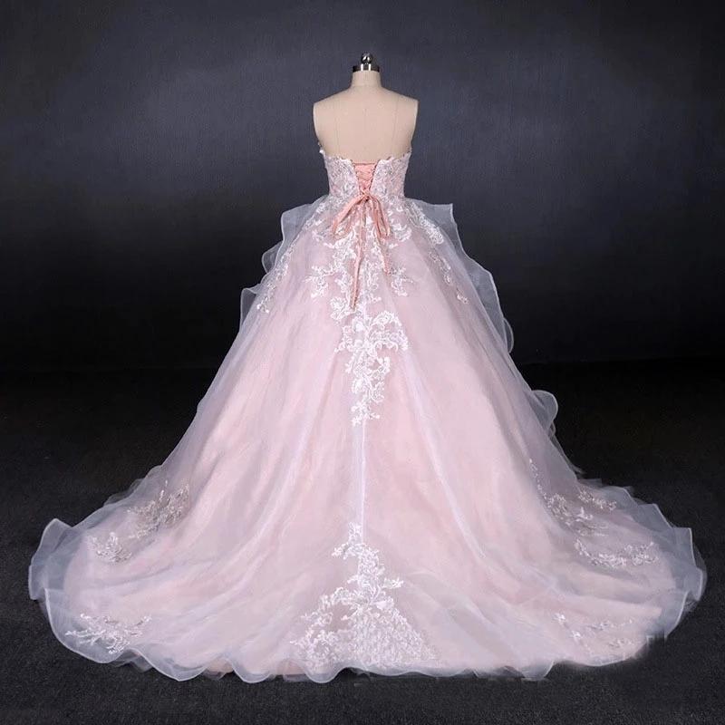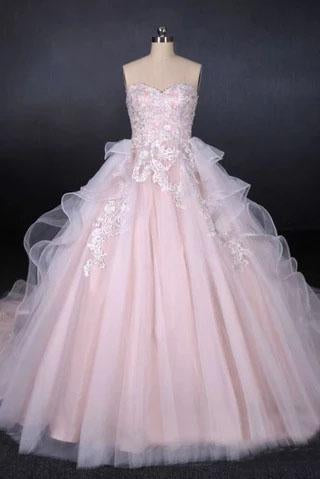 Ball Gown Strapless Sweetheart Wedding Dresses with Lace Applique, Tulle Prom Dresses SRS15070