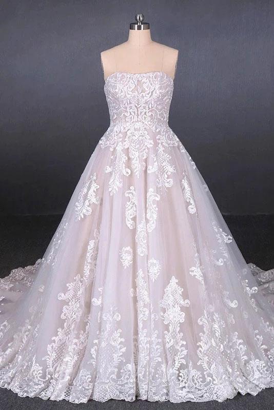 Ball Gown Strapless Wedding Dresses with Lace Applique, Lace Up Bridal Dress SRS15071