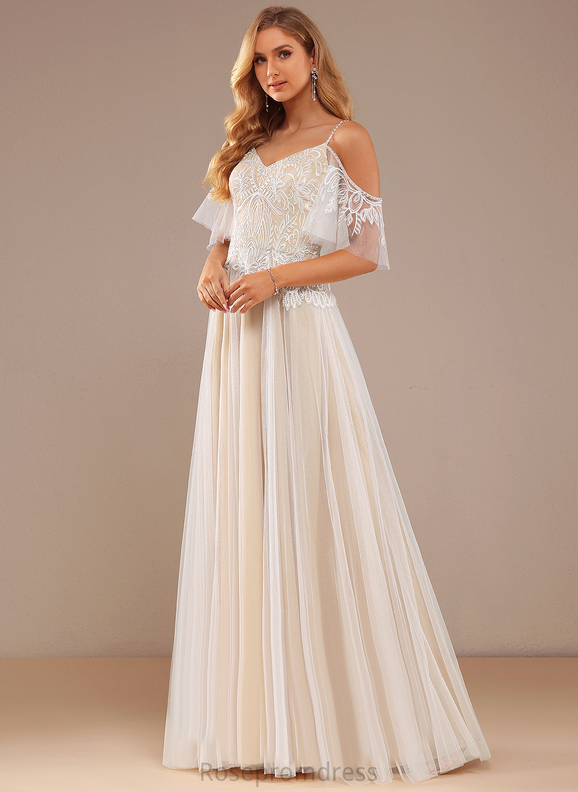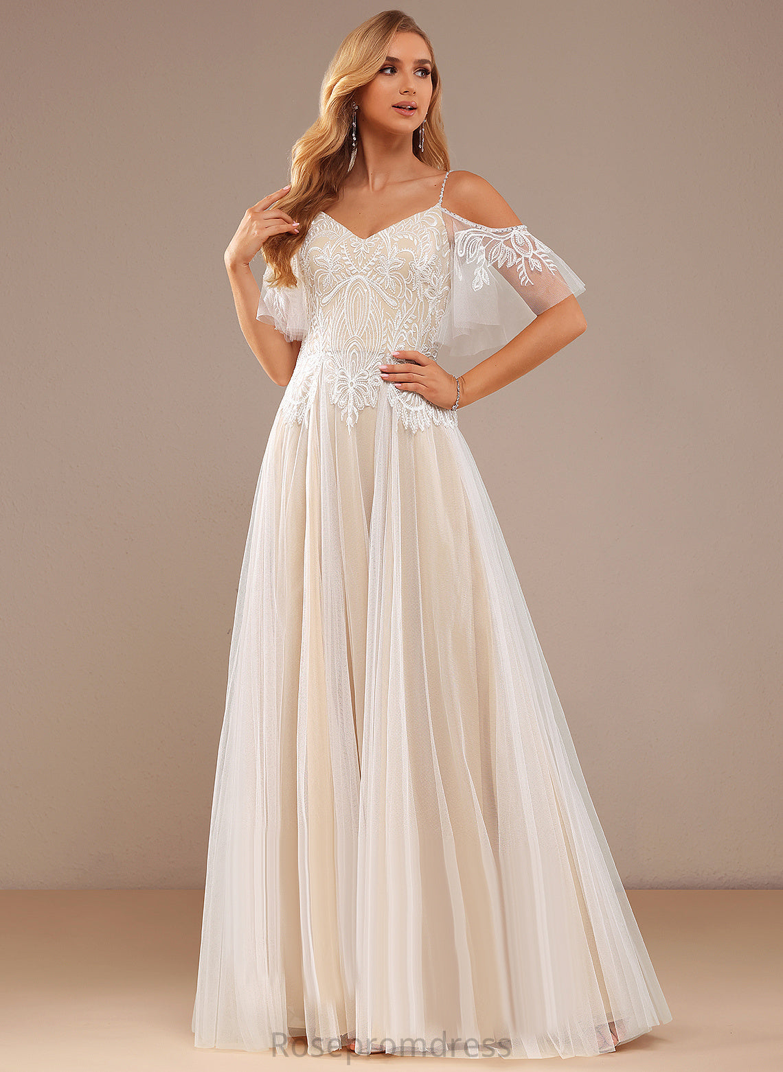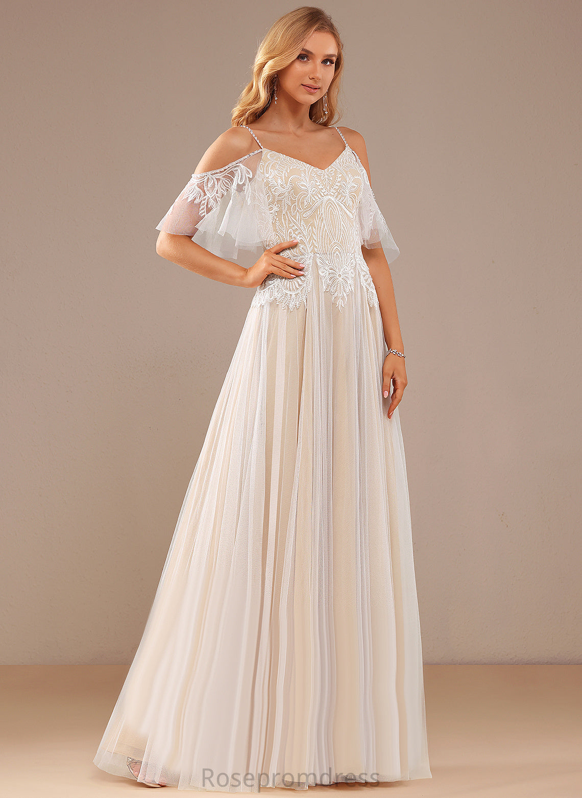 Beading Lace Tulle Sequins Wedding Lace A-Line Zoe Dress With Floor-Length V-neck Ruffle Wedding Dresses