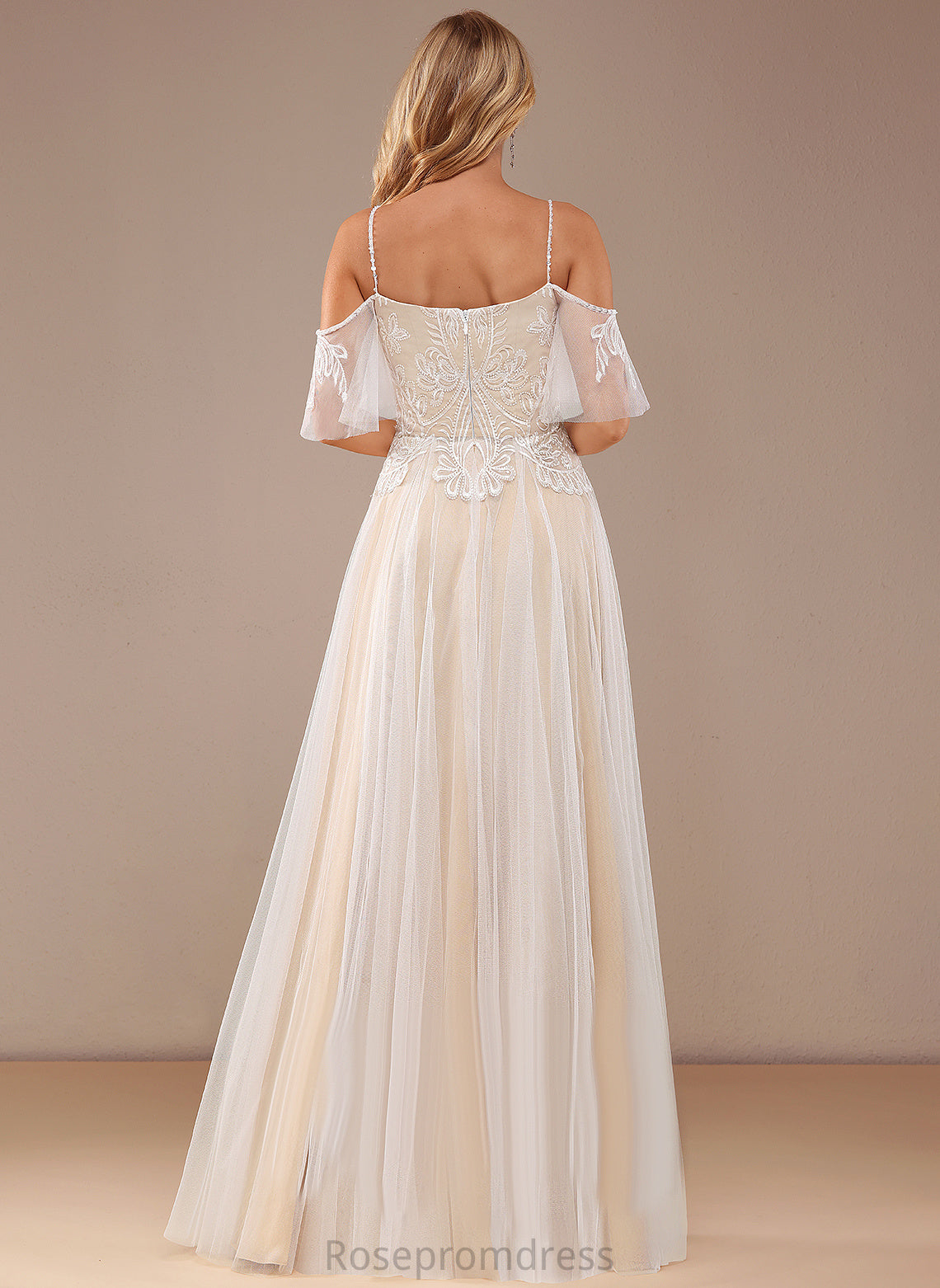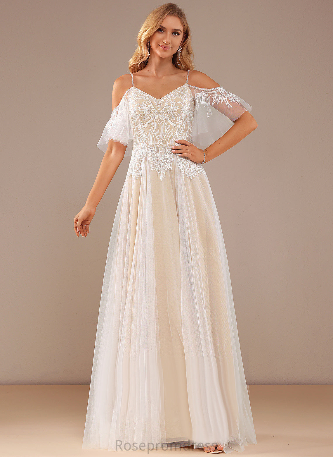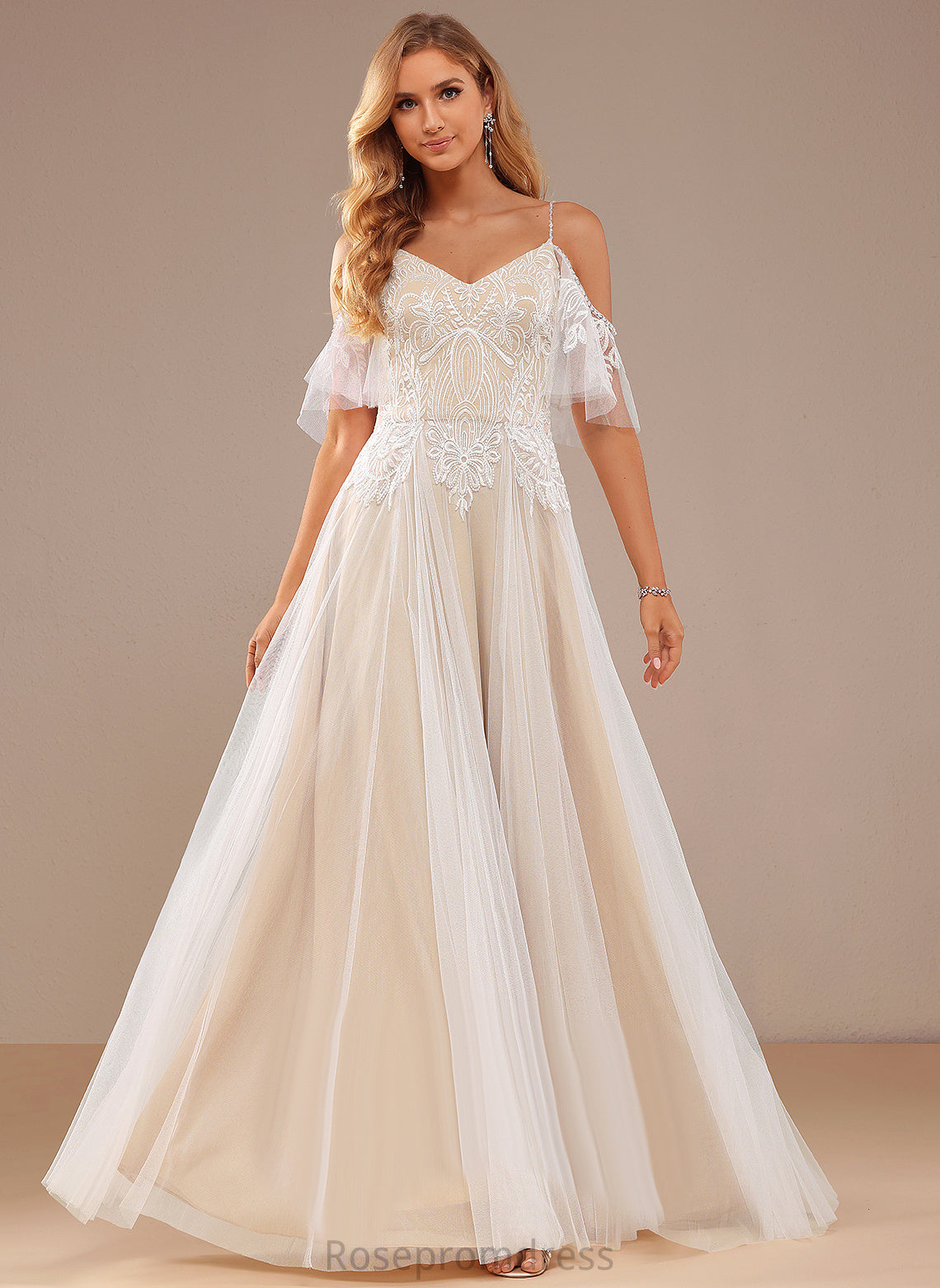 Beading Lace Tulle Sequins Wedding Lace A-Line Zoe Dress With Floor-Length V-neck Ruffle Wedding Dresses