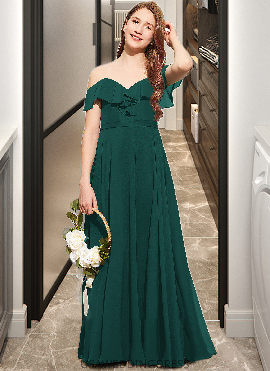 Bianca A-Line Off-the-Shoulder Floor-Length Chiffon Junior Bridesmaid Dress With Cascading Ruffles DSP0013635
