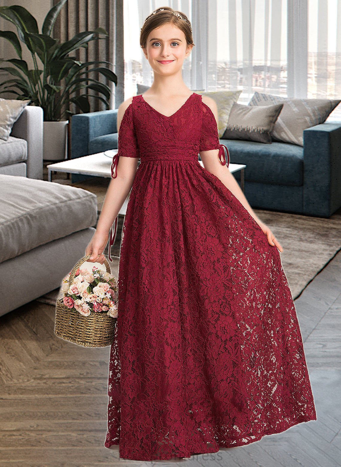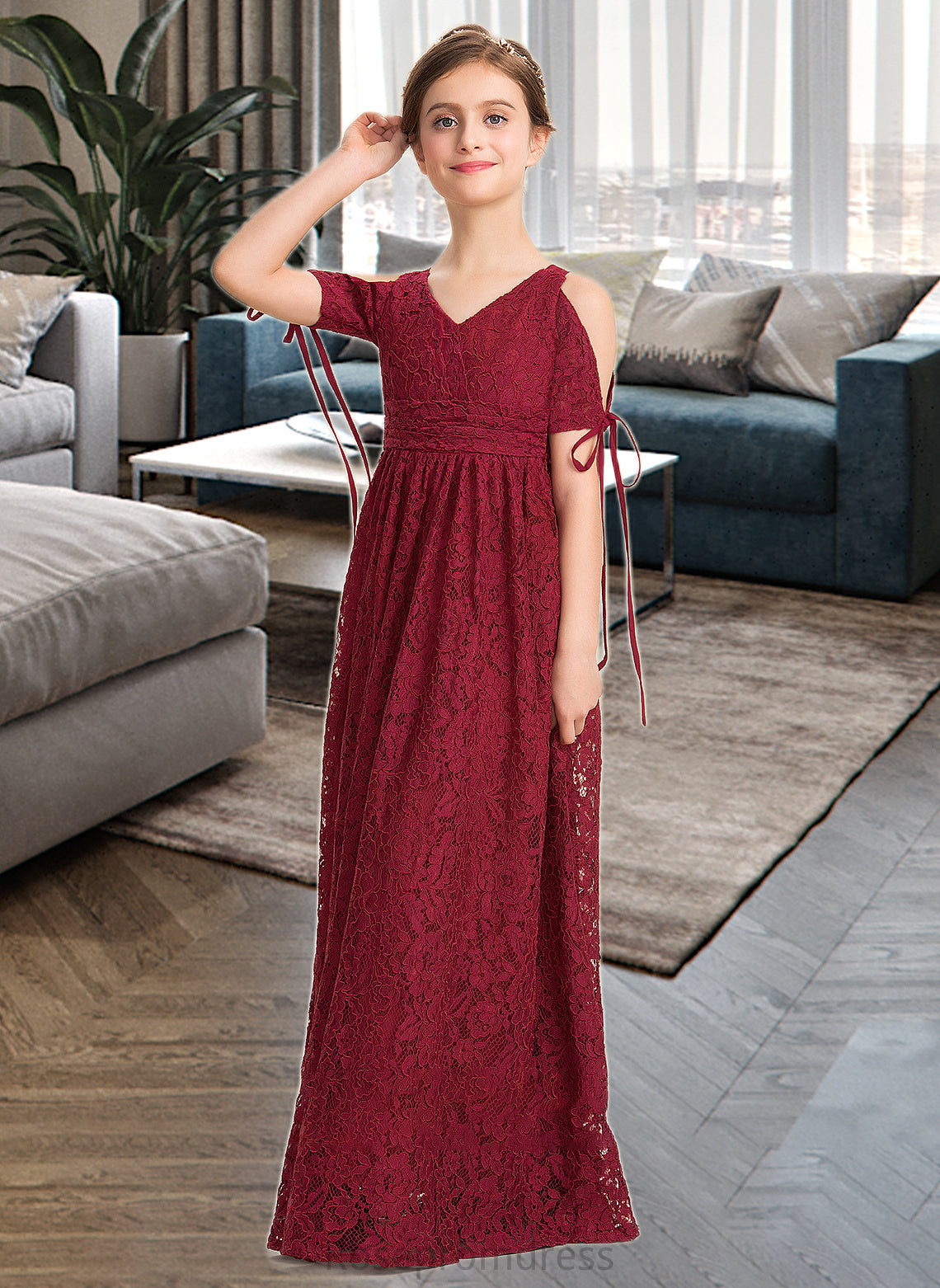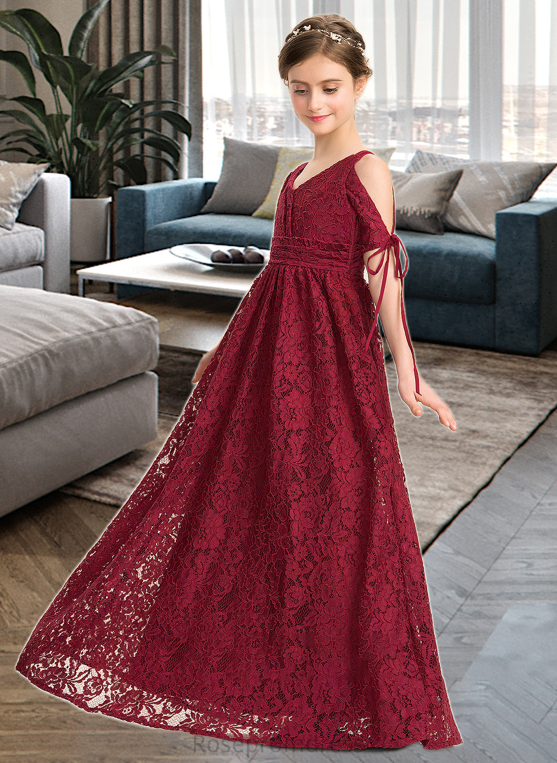 Braelyn A-Line V-neck Floor-Length Lace Junior Bridesmaid Dress With Ruffle Bow(s) SRSP0013581
