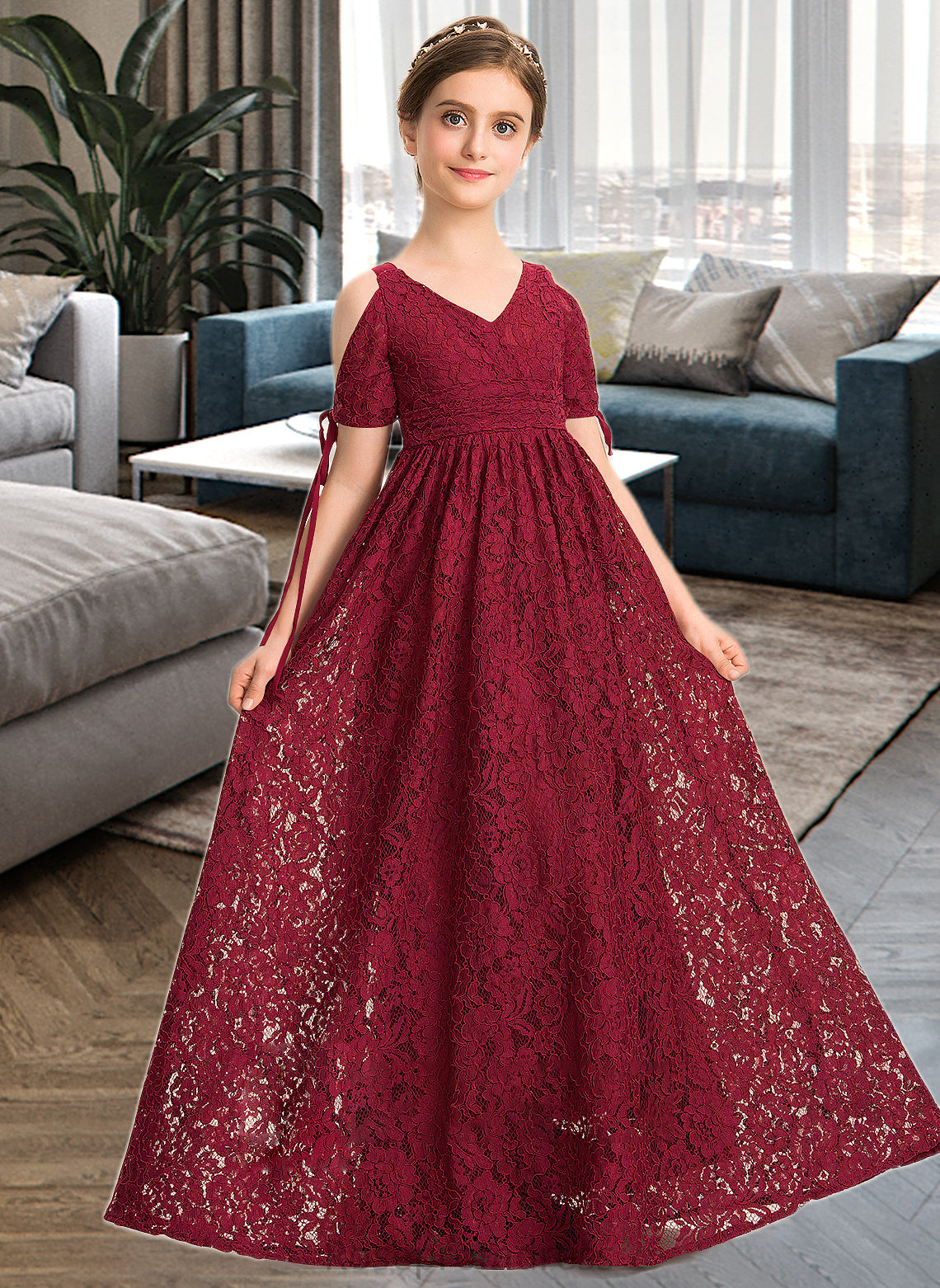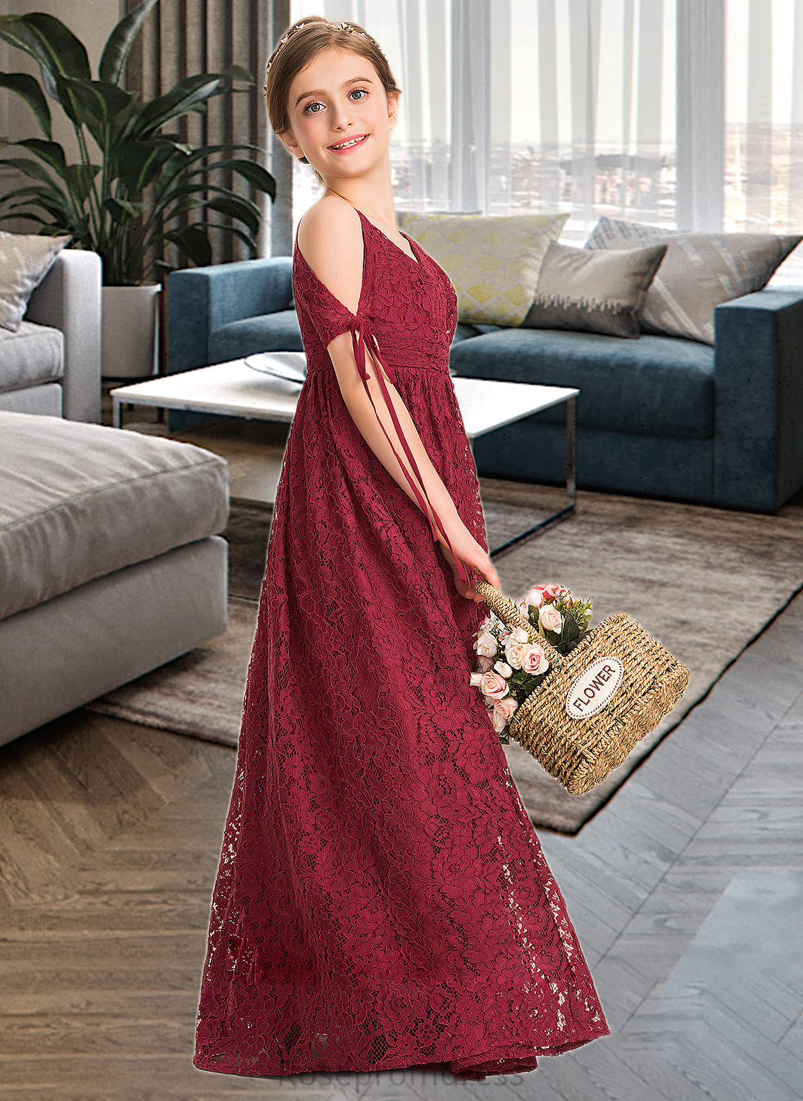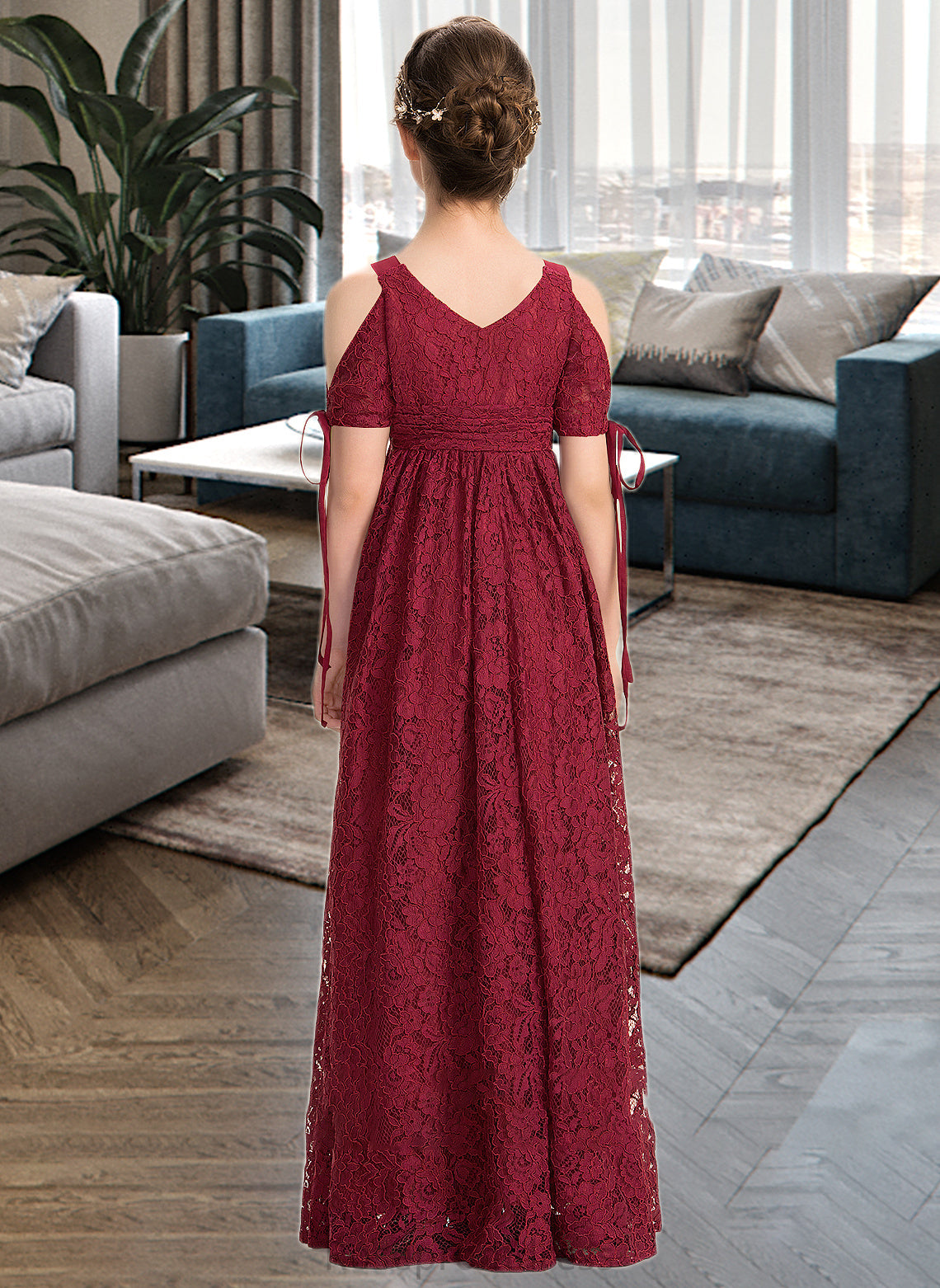 Braelyn A-Line V-neck Floor-Length Lace Junior Bridesmaid Dress With Ruffle Bow(s) SRSP0013581