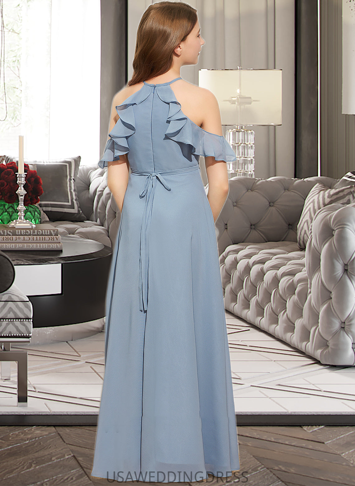 Brooklyn A-Line Scoop Neck Floor-Length Chiffon Junior Bridesmaid Dress With Bow(s) Cascading Ruffles DSP0013433