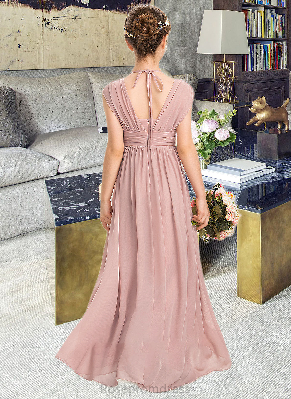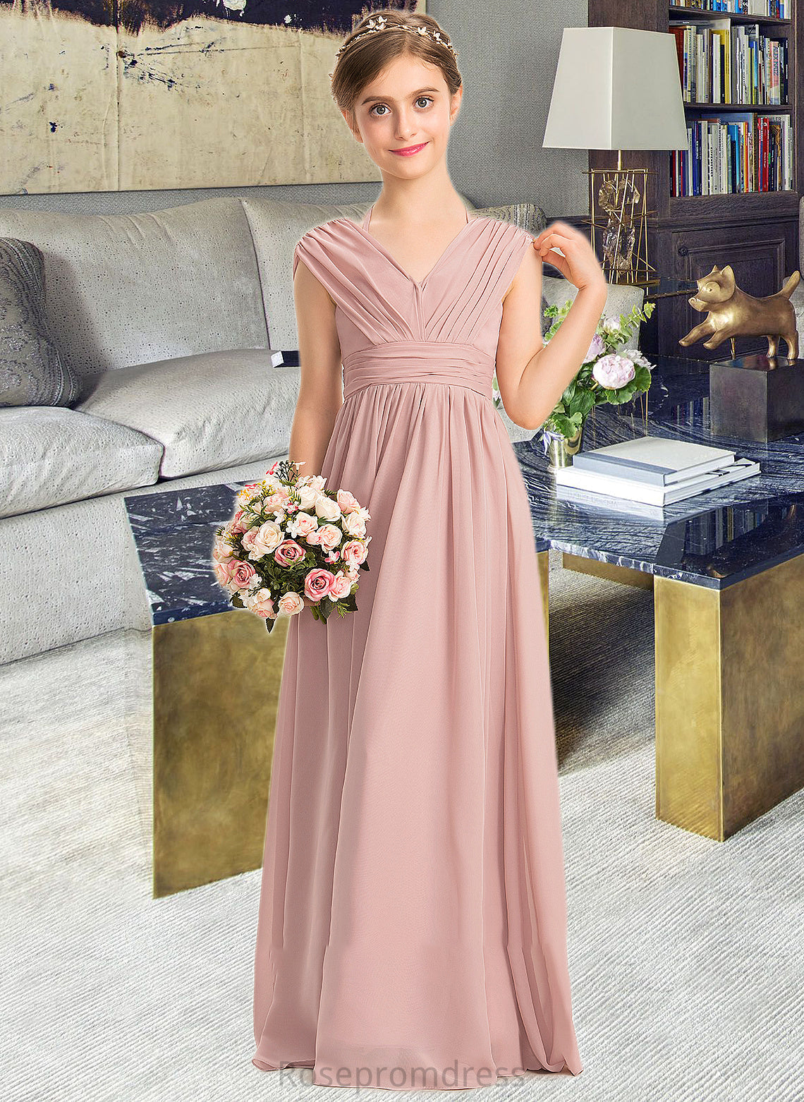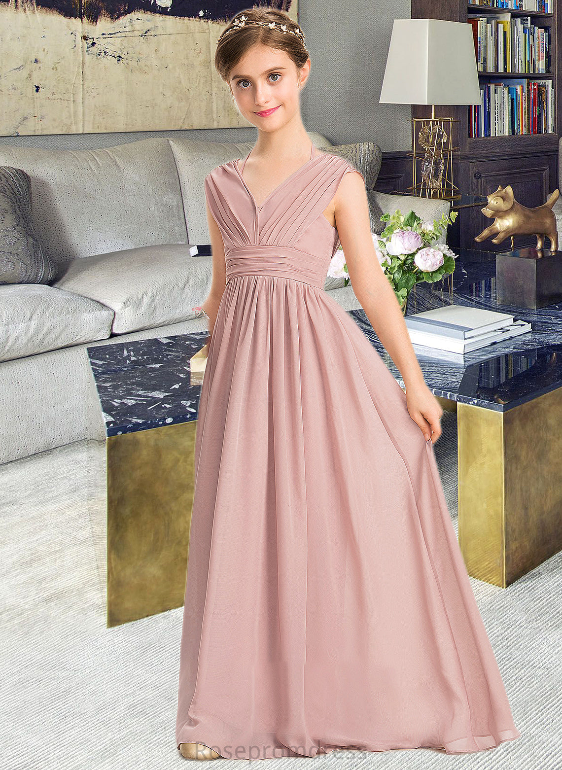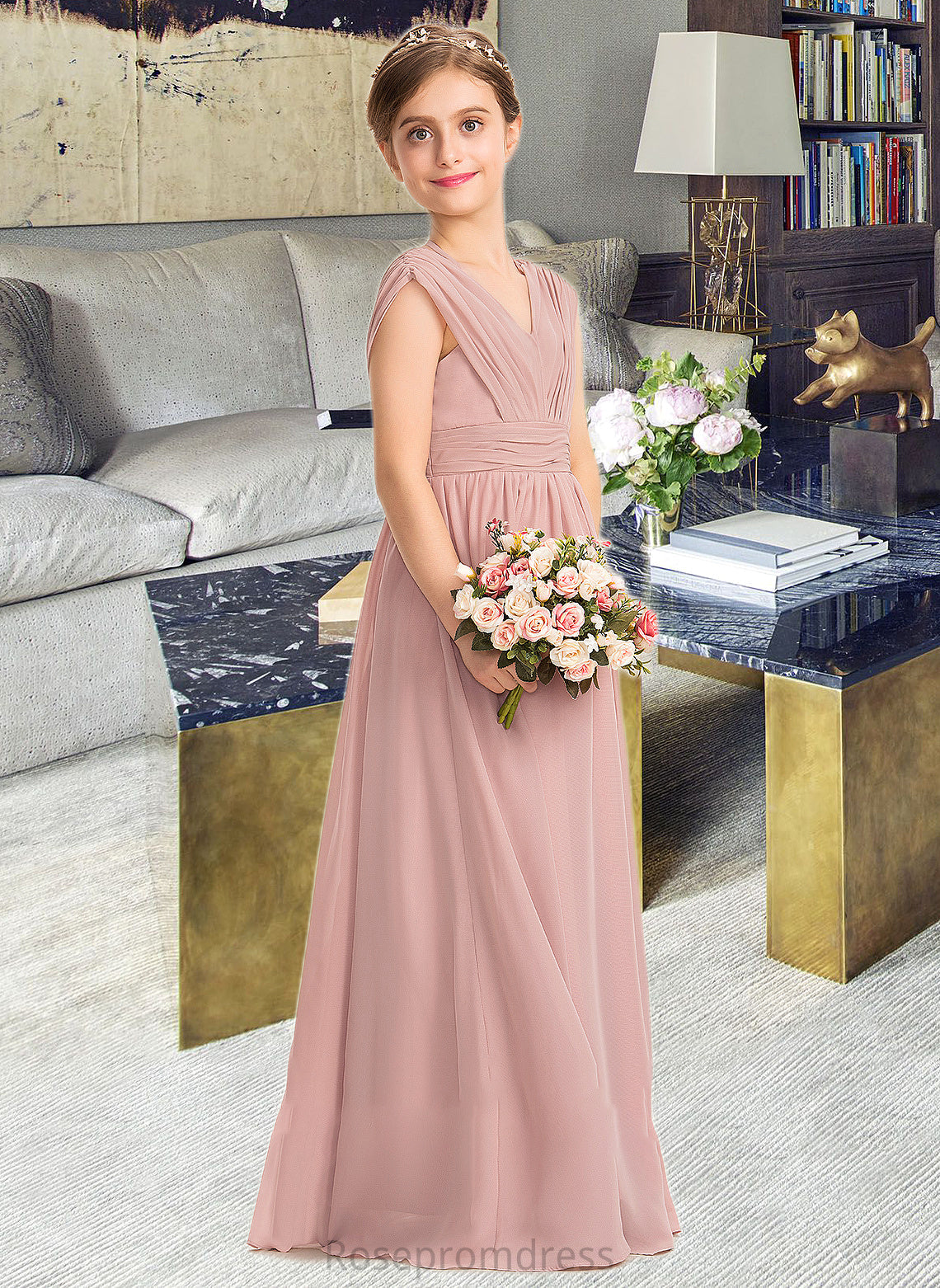 Cailyn A-Line V-neck Floor-Length Chiffon Junior Bridesmaid Dress With Ruffle Bow(s) SRSP0013378