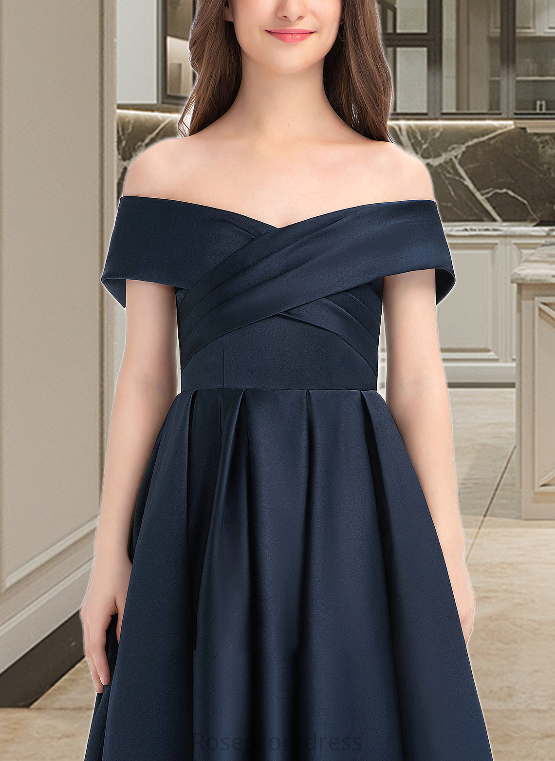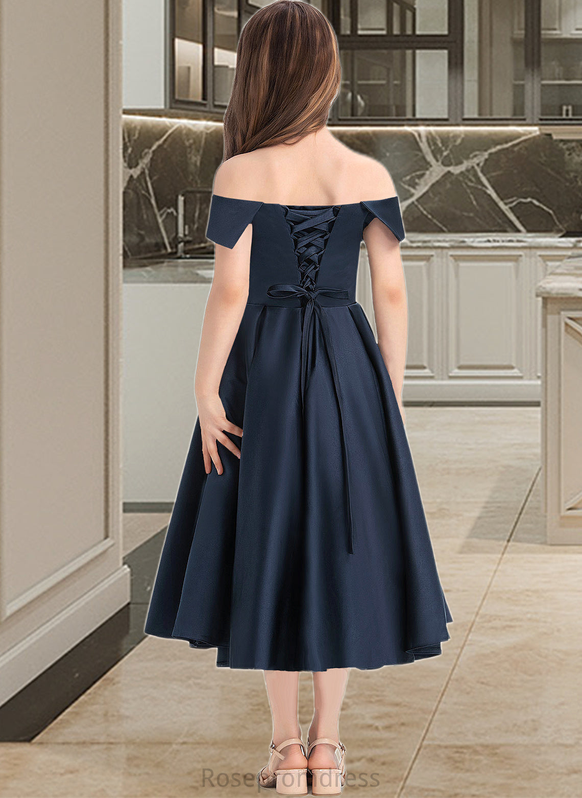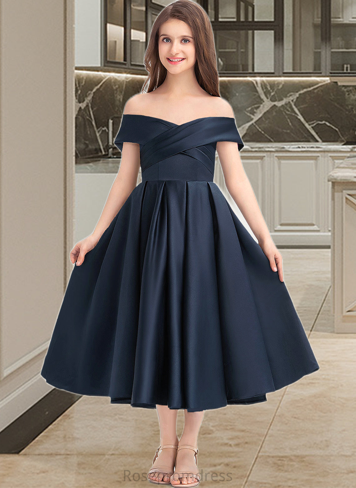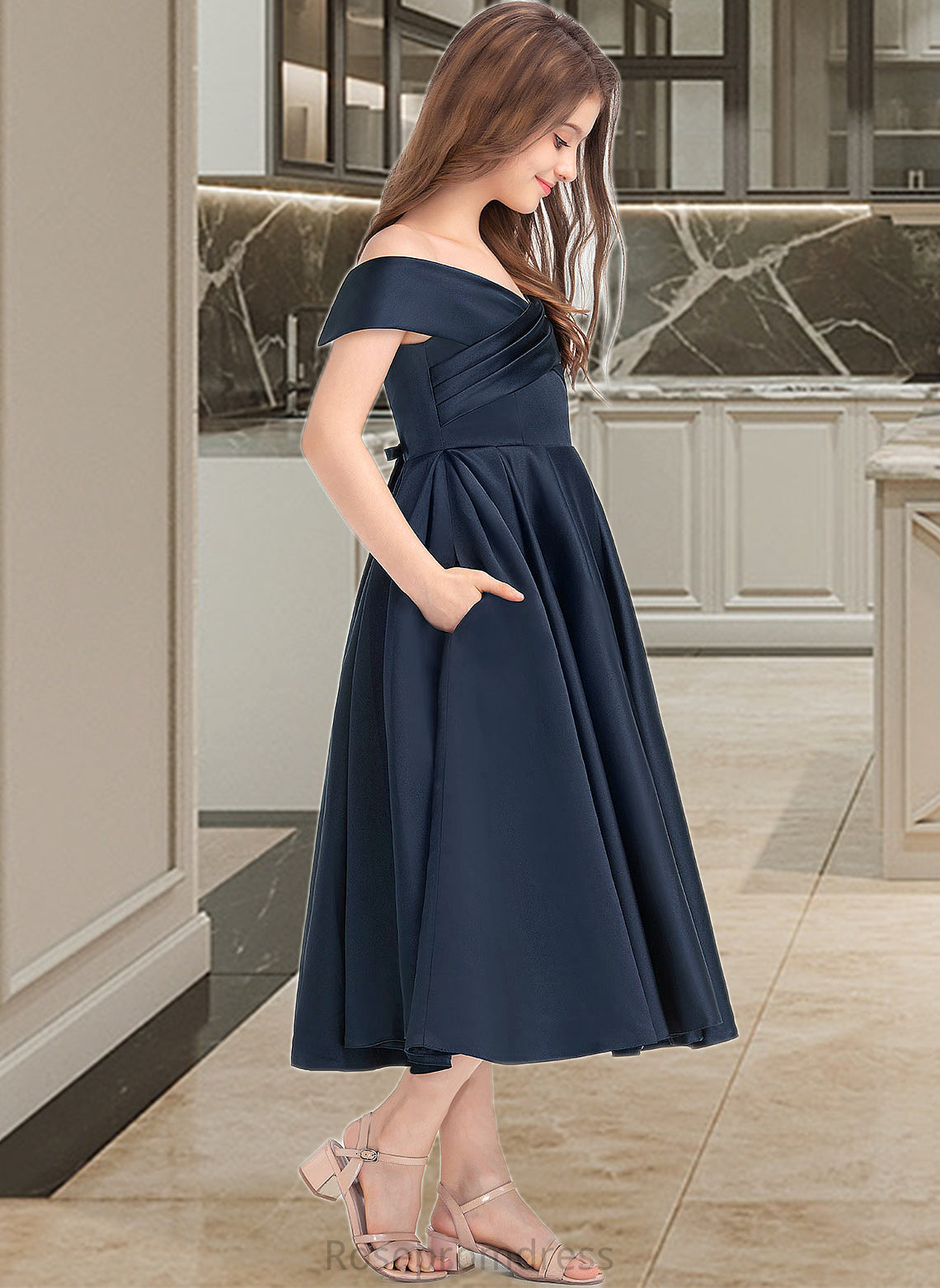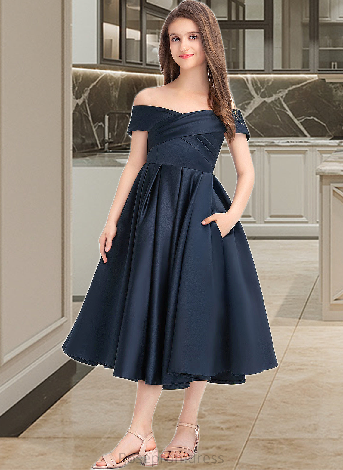 Carissa A-Line Off-the-Shoulder Tea-Length Satin Junior Bridesmaid Dress With Ruffle Pockets SRSP0013383