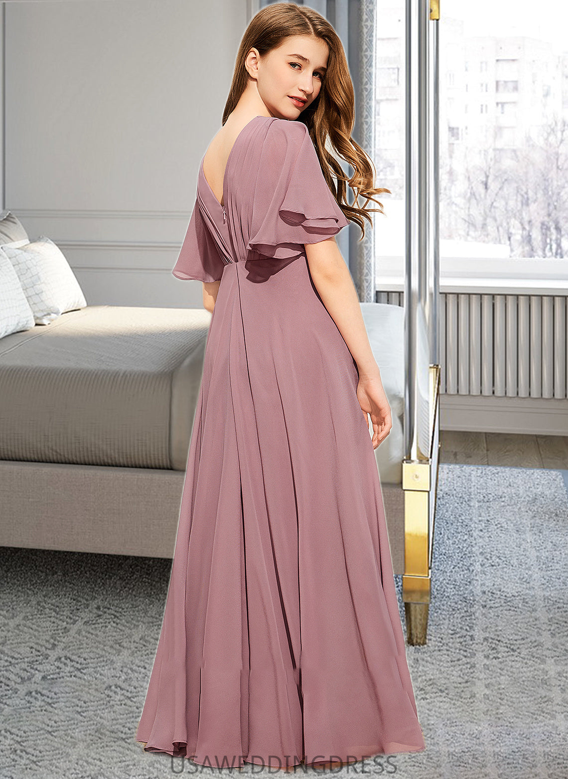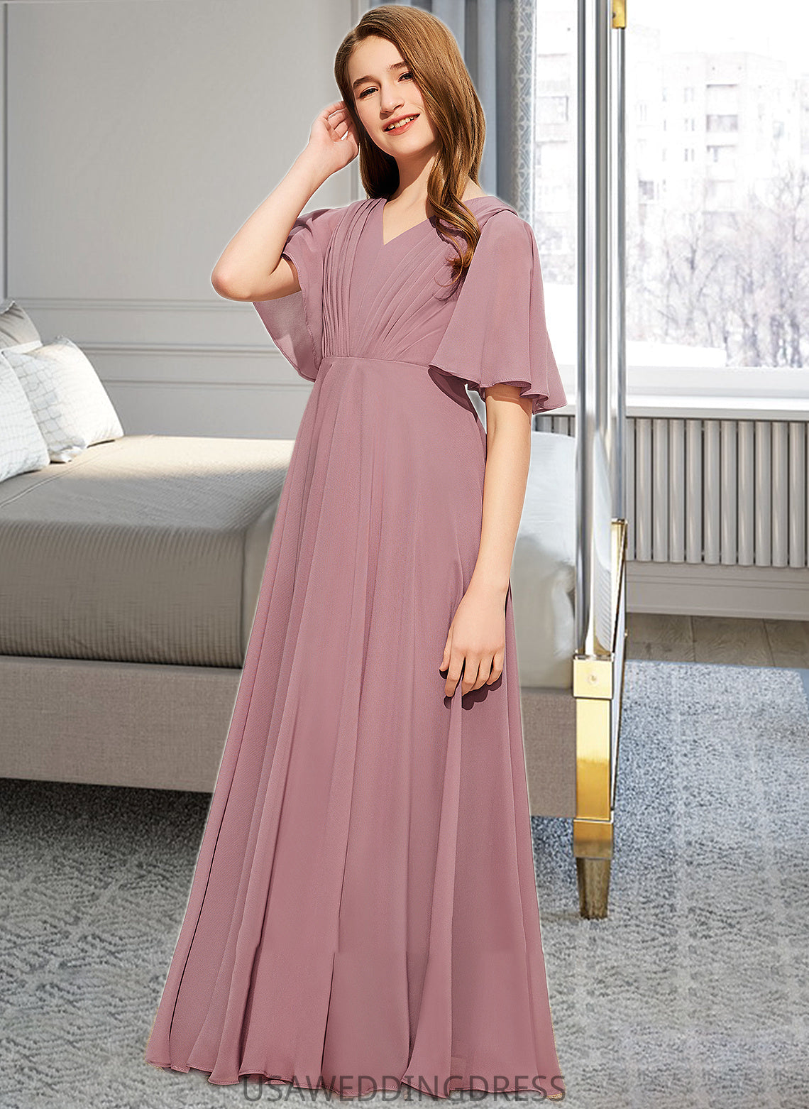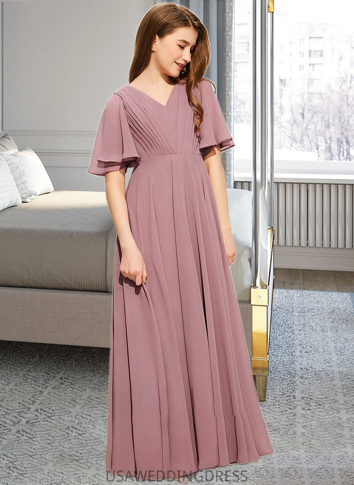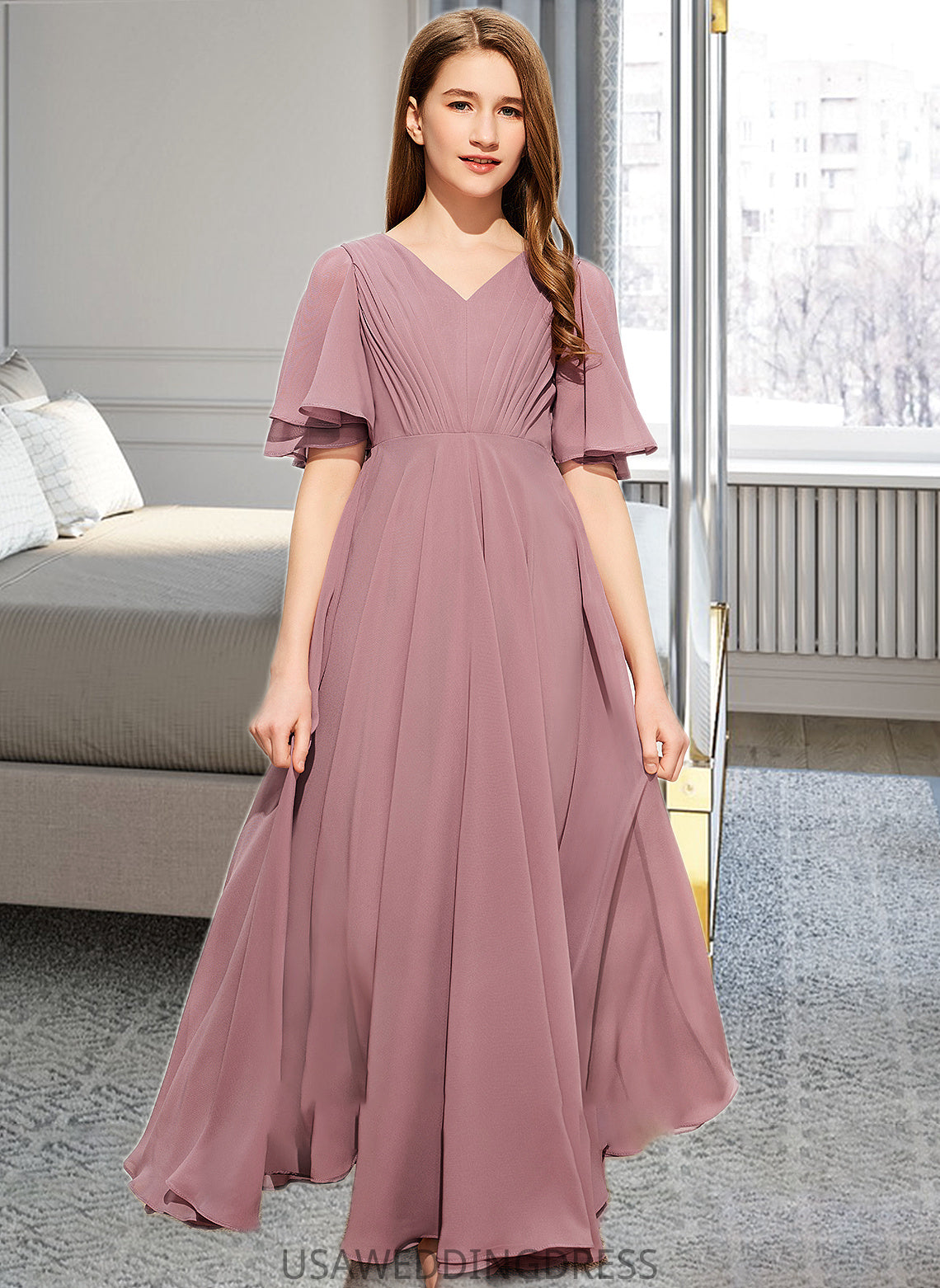 Carly A-Line V-neck Floor-Length Chiffon Junior Bridesmaid Dress With Ruffle DSP0013510
