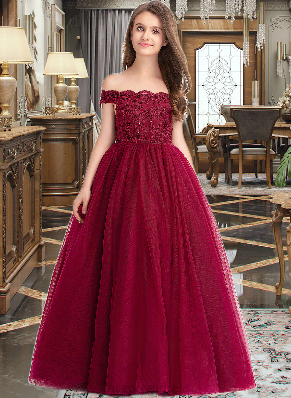 Caylee Ball-Gown/Princess Off-the-Shoulder Floor-Length Tulle Lace Junior Bridesmaid Dress With Beading Sequins SRSP0013440